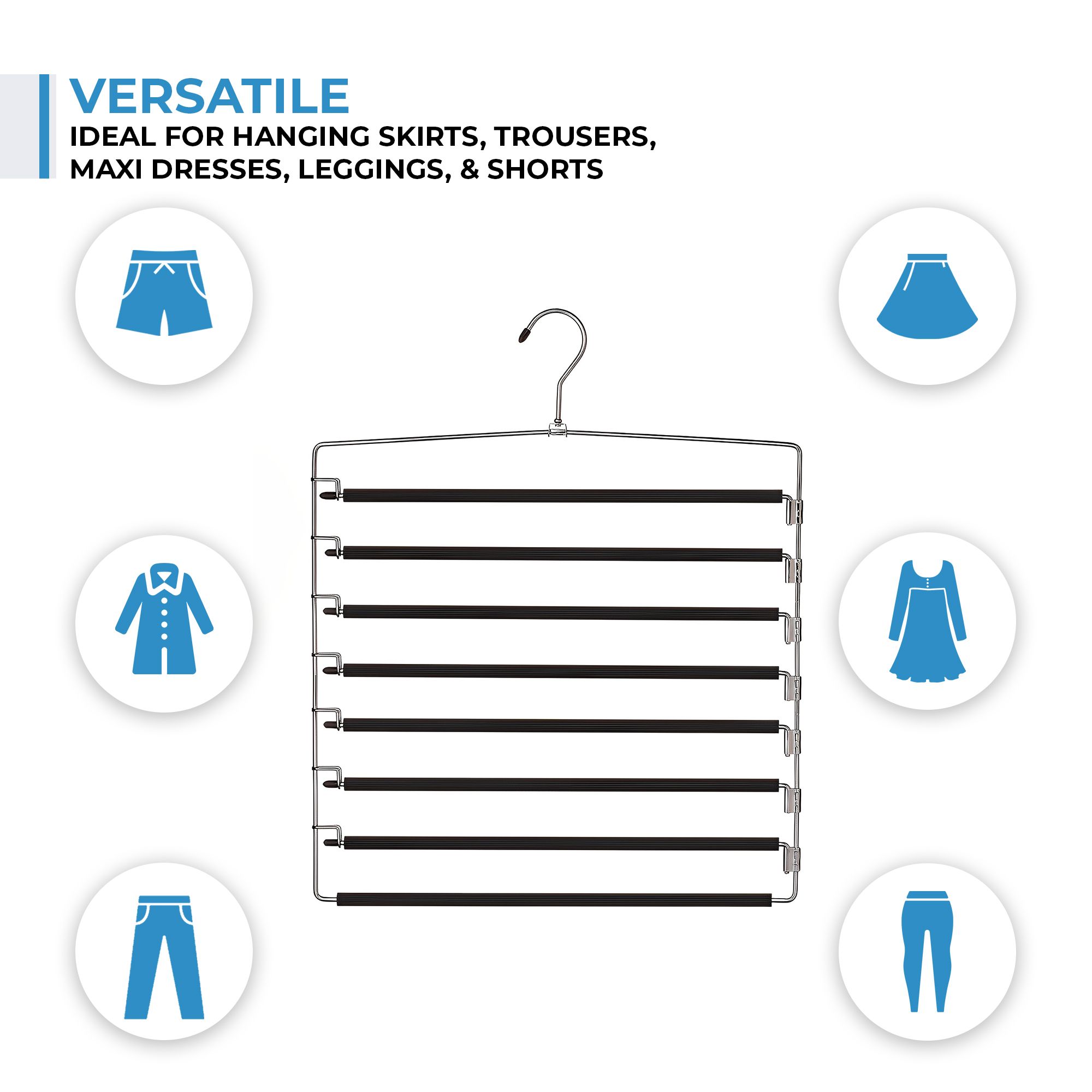 The 8-tier was designed with exceptional space saving in mind. Though its primary use is the ability to hang 8 pants, it can be used to organize various other items such as skirts, shorts, leggings, undergarments, ties, scarfs, towels, and masks, amongst many other things. This is an essential space saver for small closets. The grooved non-slip padded swing arms provide easy access to your garments while protecting even your most delicate garments from unwanted creasing and stop them from sliding off the hanger. The ends of each arm have also been capped to protect your clothes. Made with a heavy-duty 4 mm chrome steel frame to ensure that the hanger can hold garments on all 8 bars at the same time. The hanger's use is not limited to your closet. Use it in the bathroom for towels. In the pantry for dish cloths and aprons. In the laundry room to hang dry garments. In the garage for rags and cloths.