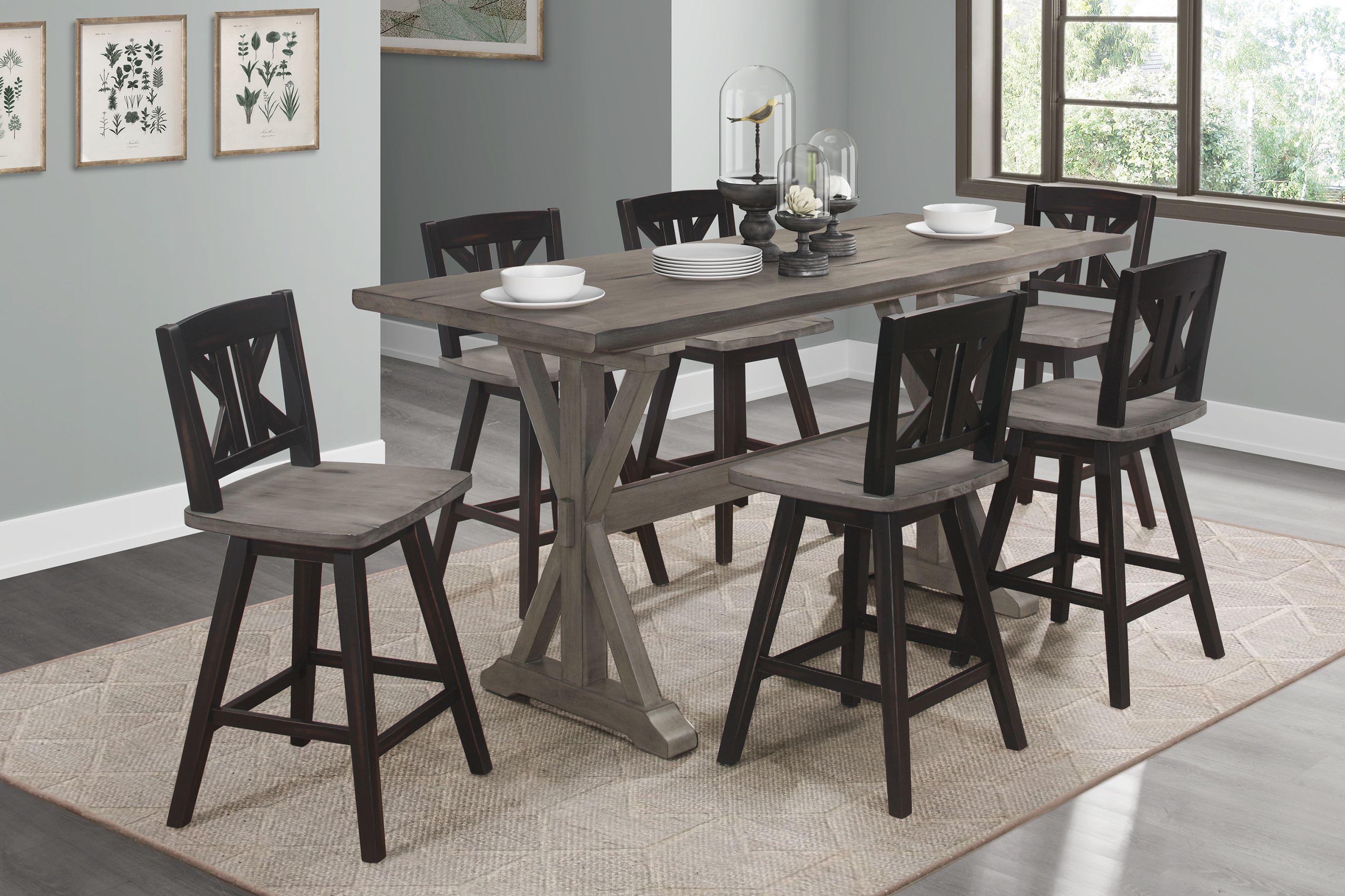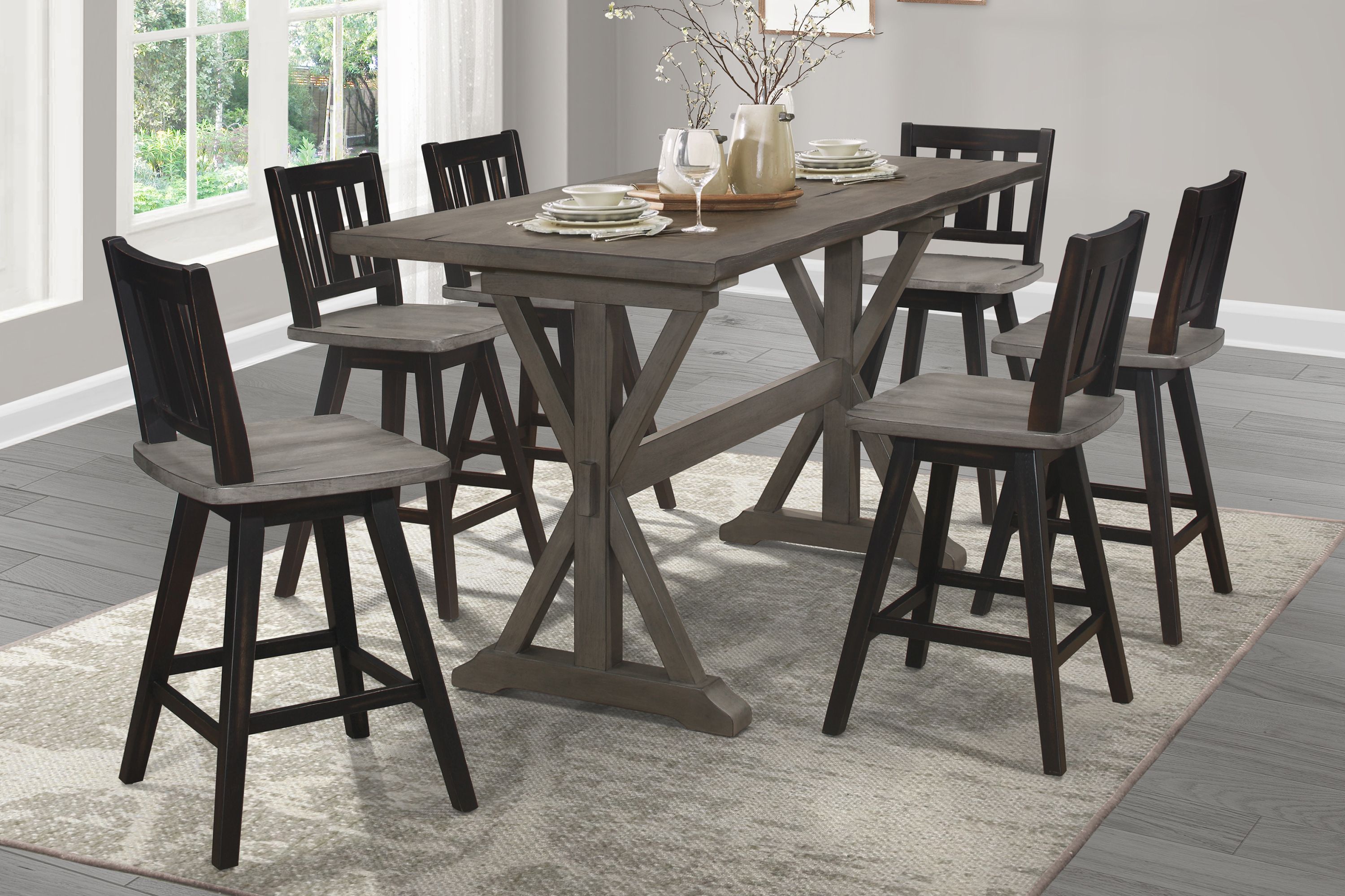 Creating a subtle rustic look for your dining space is the Amsonia Collection. A gray finish graces the solid rubberwood dining table highlighting the veneer. The sturdy base lends to the rusticated styling that will help to provide a platform for your mealtime and social activities. Also available are the alternate finishes of the contrasting 24-inch swivel-seat chairs, offered in black sand-though and white sand-through.PRODUCT DIMENSIONS: Overall Dimension: 30.5" x 72" x 36"HApron to floor: 33"Listing Includes: One Counter Height Table Only.Chairs: Not included.Simple Assembly Require.