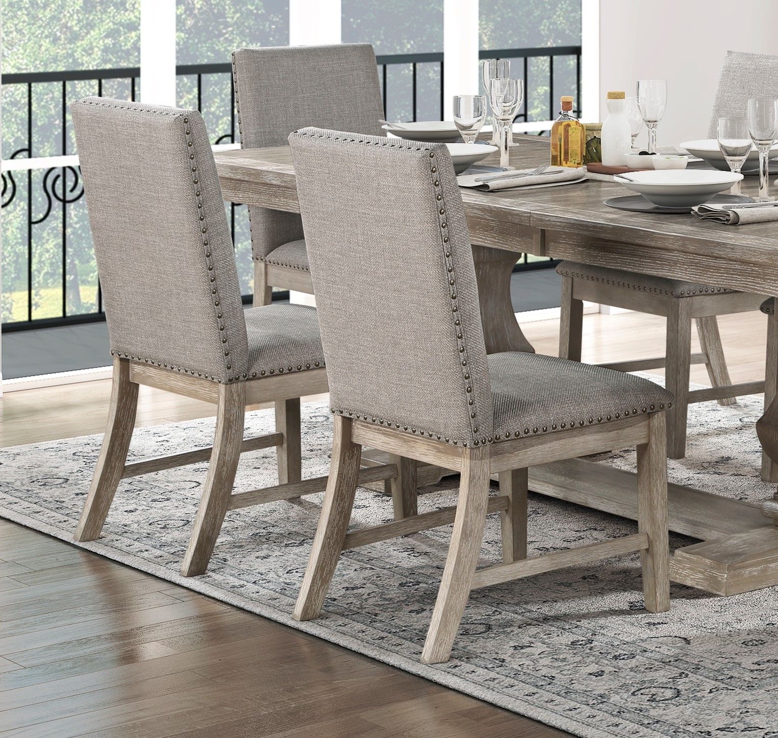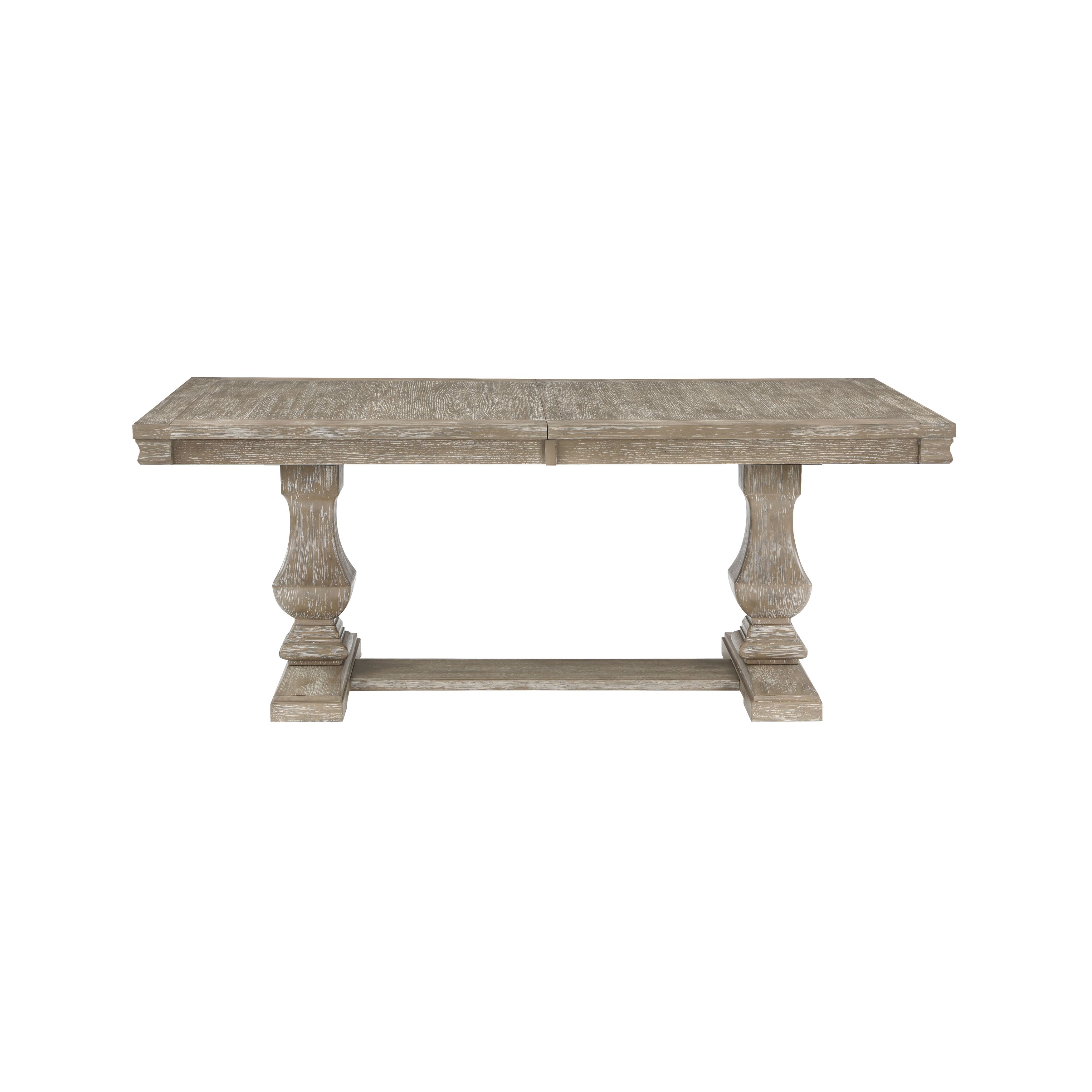An elegant blend of traditional styling and rustic aesthetic combines to create the look of the Southlake Collection. The rectangular tabletop is supported by a double pedestal base, it's urn profile lending distinct accent to your dining room. The wire-brushed brownish-gray finish highlights the oak veneer and solid wood construction. The brown linen-covered seats and backs of the side chairs provide complementing contrast to the table. PRODUCT DIMENSIONS: DINING TABLE: 40" x 76.5" - 94.5" x 30.5"HApron to floor: 27"Length of leaf: 18" x 1SIDE CHAIRS: 20" x 25" x 39.5"HSeat Width: 20"Seat Depth: 17.5"Seat Height: 19.5"Listing Includes: 5pc Dining Set (1 Dining Table and 4 Side Chairs) Only.Simple Assembly Require.