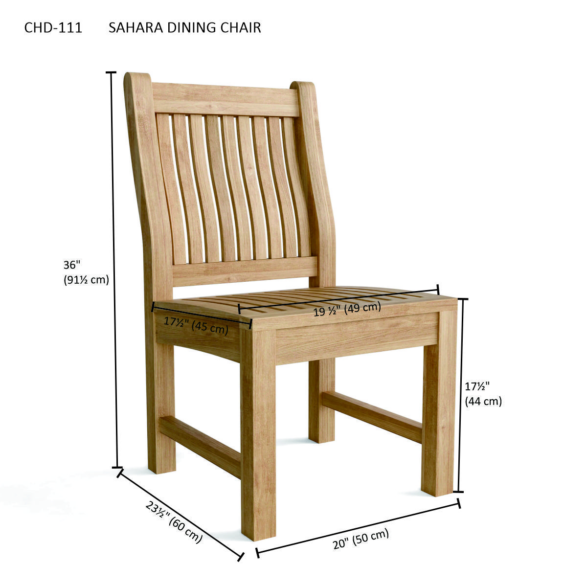 The Sahara Dining Chair features a curved back support and a slanted seating angle that adds comfort to your lumbar and legs for a comfortable dining experience. Designed with a classic style, the looks of this chair will never go out of style, but quietly blends with any decor or design. Made with kiln-dried, Premium Teak wood, the chair is sanded smooth without finish in its natural form and color. Made from the finest solid teak, which is strong and durable, this is a beautiful and functional piece of furniture for your patio or terrace that was made to last. Place multiple chairs with our teak dining table for an outdoor dining experience.