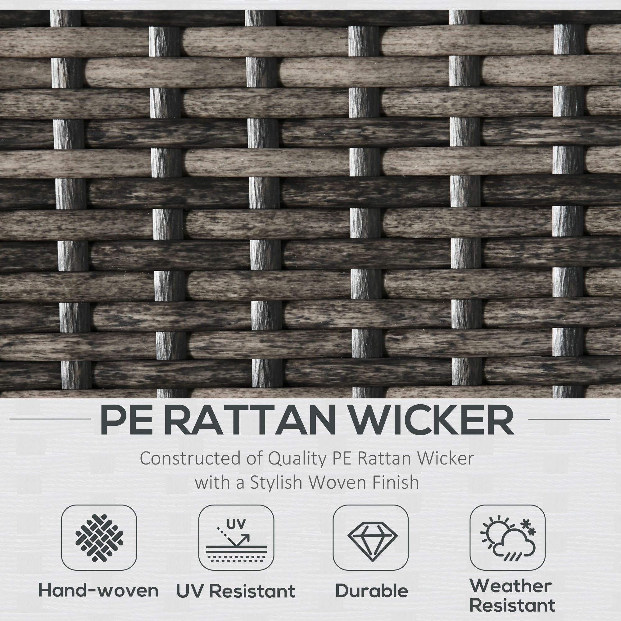 This four-piece rattan patio furniture set brings indoor dining comfort to your backyard. Everything is there, a loveseat sofa, two chairs, and a metal table. Each seat has a thickly padded cushion allowing you a cozy spot outside. Invite over guests; with an outdoor table, you have a space for dinner, drinks, and decorations. Made of water-safe PE plastic and a supportive steel frame, this outdoor set was handwoven with outdoor in mind. Get out, get comfy, get Outsunny.