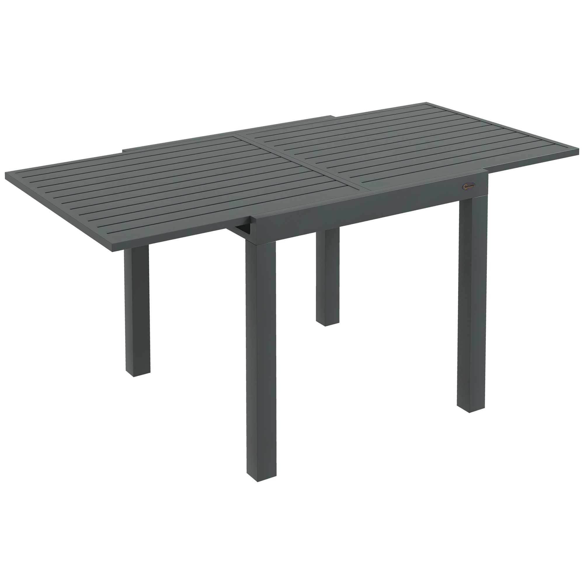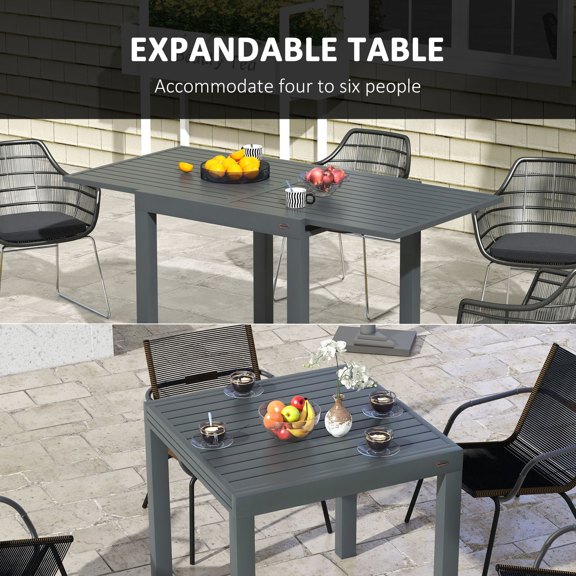 Big when you need it to be, compact when you don't, Outsunny's extendable patio dining table is a surface that adapts. Seat four, and when company comes over, pull on your patio table, and it stretches to fit six. This dining table is made of powder-coated aluminum, making it water-safe, easy to move, and easy to use. With a slatted build, this extendable outdoor dining table has a classic look, and rain is easier to drain. Get out, get comfy, get Outsunny.