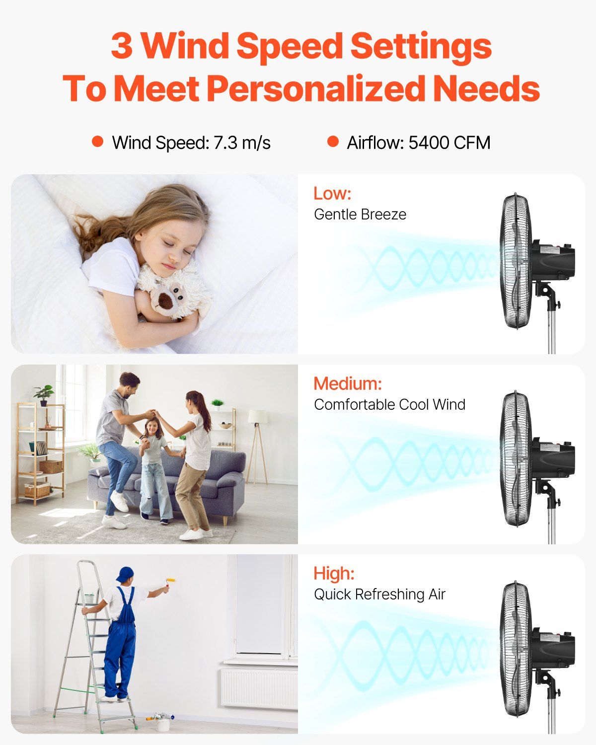 2.3-Speed Adjustable: This standing fan offers 3 adjustable speed settings, allowing you to tailor the airflow for sleep, relaxation, or indoor activities. With a powerful 4200 CFM airflow and a wind speed of 7.3 m/s, you'll stay cool and refreshed