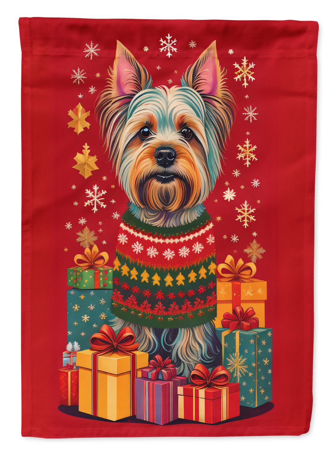 House Flag featuring breed specific Silky Terrier artwork. Celebrate Christmas with this Christmas Large Flag. Presenting our Heavy Duty Polyester House Size Decorative Sleeve Pole Flag, a vibrant addition to enhance the aesthetic appeal of your home. This large decorative flag, measuring approximately 28 x 40 inches, offers ample coverage and visibility. Each flag is meticulously sewn and made individually, ensuring a unique piece that may slightly vary in size. It's a sleeve pole flag, designed to fit a standard decorative flag pole effortlessly. Please note that the flag pole and bracket are not included and should be purchased separately. What sets our flag apart is its dual-sided print. The design is mirrored on both sides of the fabric, allowing for uniform visibility regardless of the angle. Printed in full color, our flag showcases vibrant hues that truly stand out. To ensure lasting vibrancy and durability, the dyes are heat-set into the fabric. This ensures your flag remains bright and captivating through various weather conditions. Elevate the look of your home with our Heavy Duty Polyester House Size Decorative Sleeve Pole Flag!