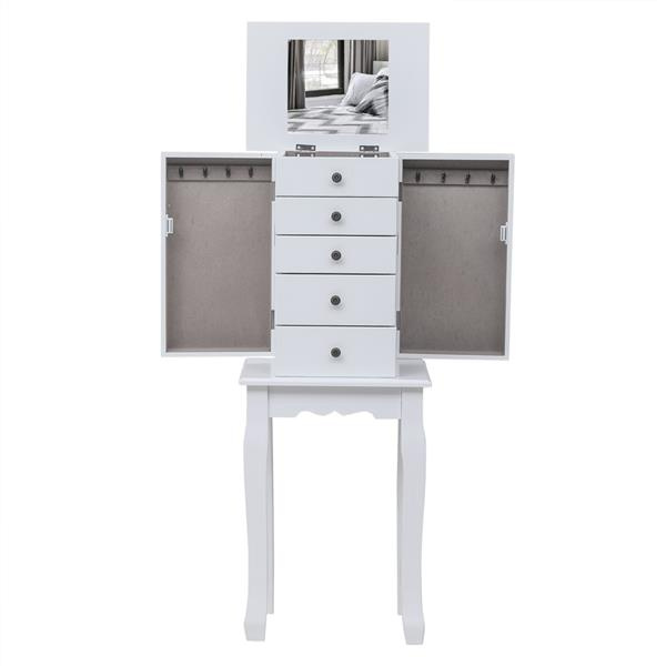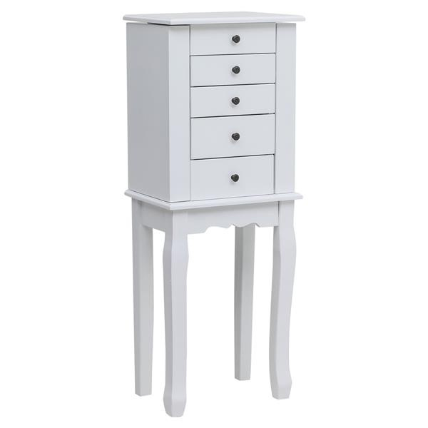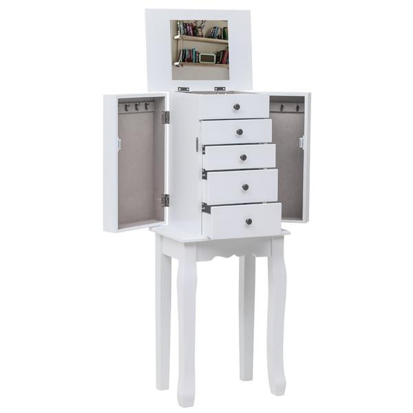 With classic and smooth lines, this jewelry cabinet is extremely attractive and functional. It can be perfectly matched with any decoration. While ensuring the elegant appearance of the product, we also have strong protection and safety. One is the grey lining to prevent your jewelry from being scratched and scratched. In addition, the anti falling design on the back can prevent the product from falling and hurting children. There are five drawers of two types, so as to meet the requirements of different placement. There are four internal partition spaces in the top storage, which can store various ornaments. The perfect drawer size is enough to meet your daily storage requirements for various items. There are 8 hooks on the two side doors of the jewelry cabinet, which is an excellent storage location for your necklace accessories. The hooks we choose are of vintage style appearance and durable material, which can set off your jewelry's high quality. High quality MDF material and solid wood legs make this jewelry armoire durable and sturdy. The design of the tall legs is also relatively easy to move. It does not directly touch the ground and prevents moisture, which increases the service life of the cabinet.