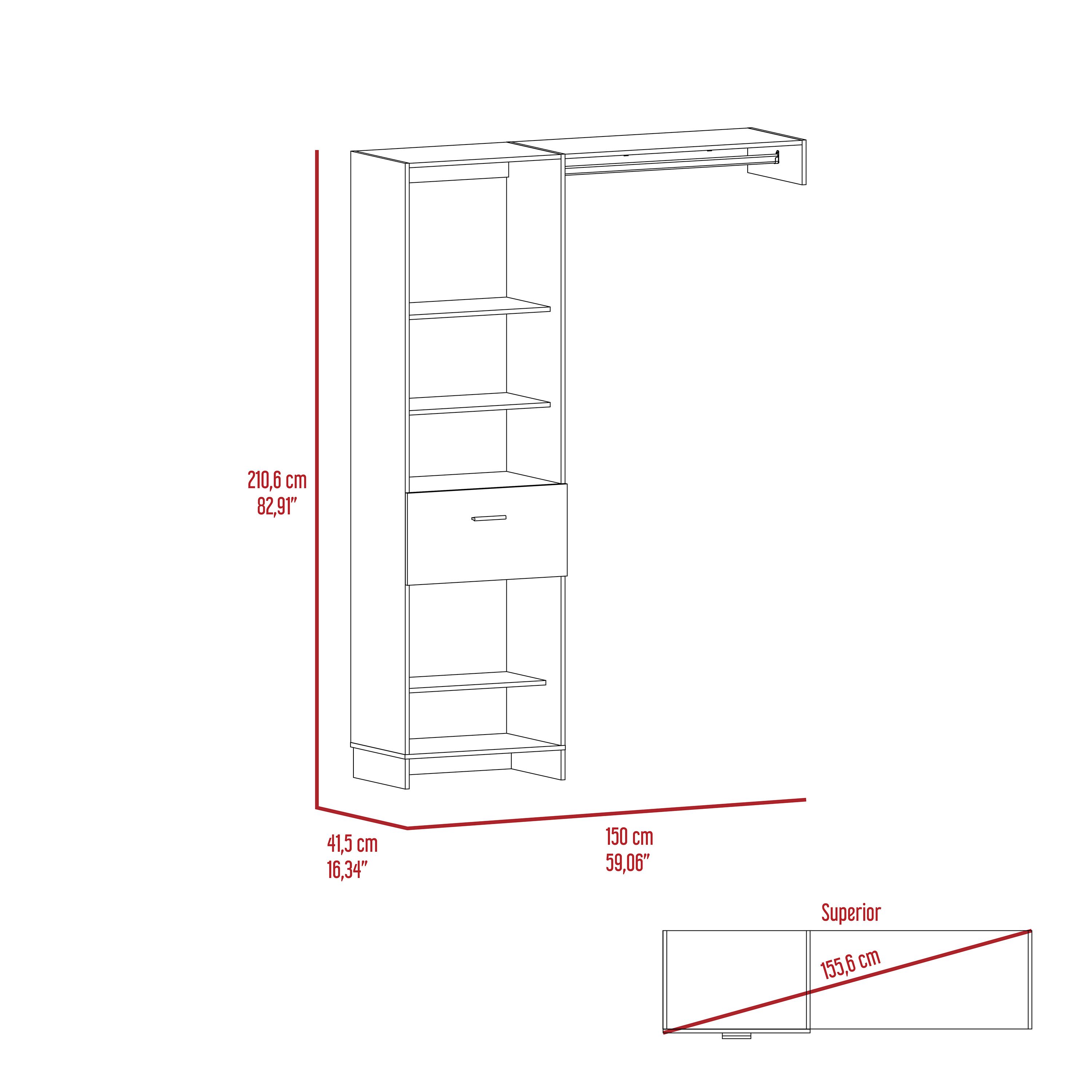 The white finish offers a clean, bright look that enhances any space and complements a wide range of interior designs, making it a versatile choice for any room. This design features four shelves for versatile storage, a single drawer for smaller essentials, and a sturdy metal rod for hanging items, providing both practicality and organization.