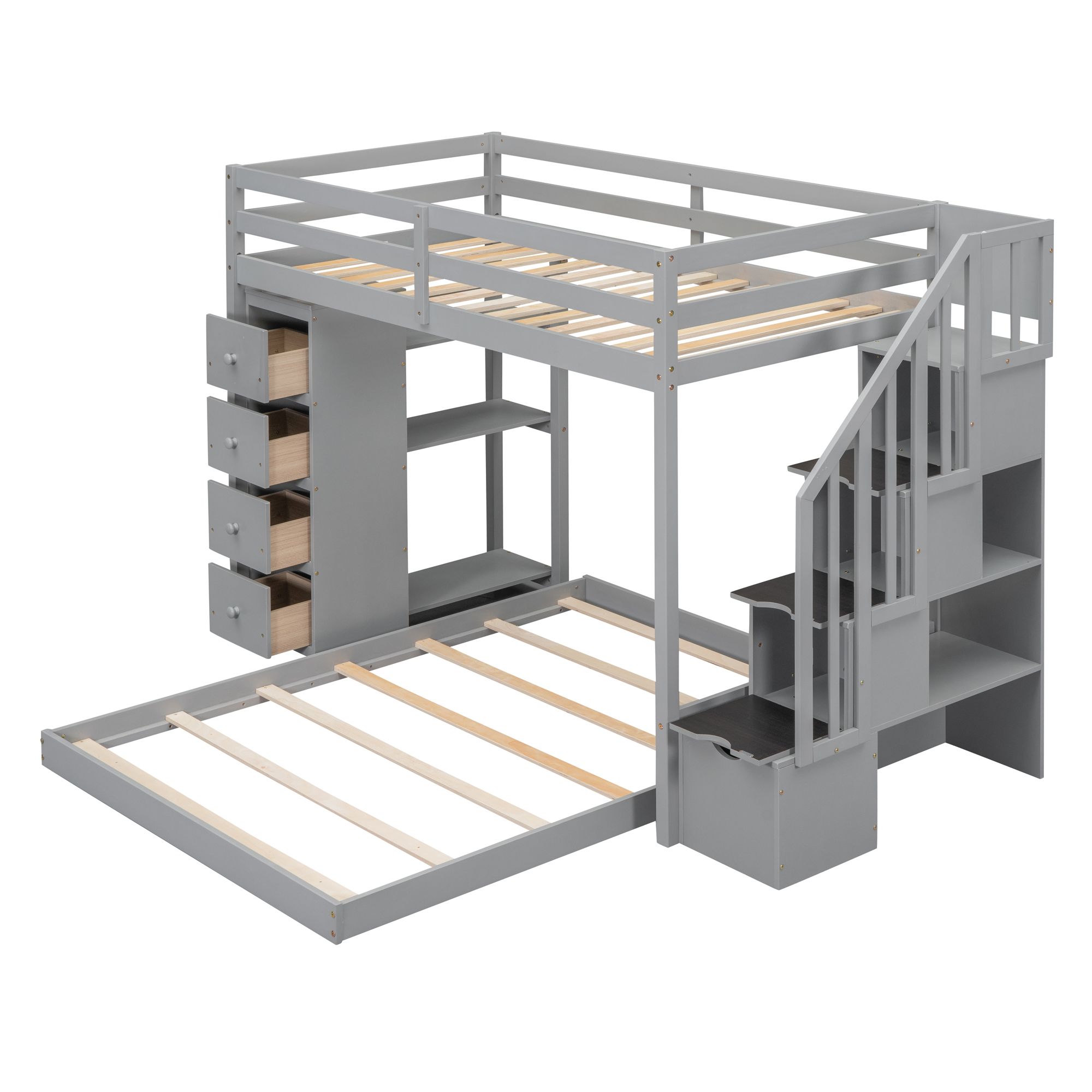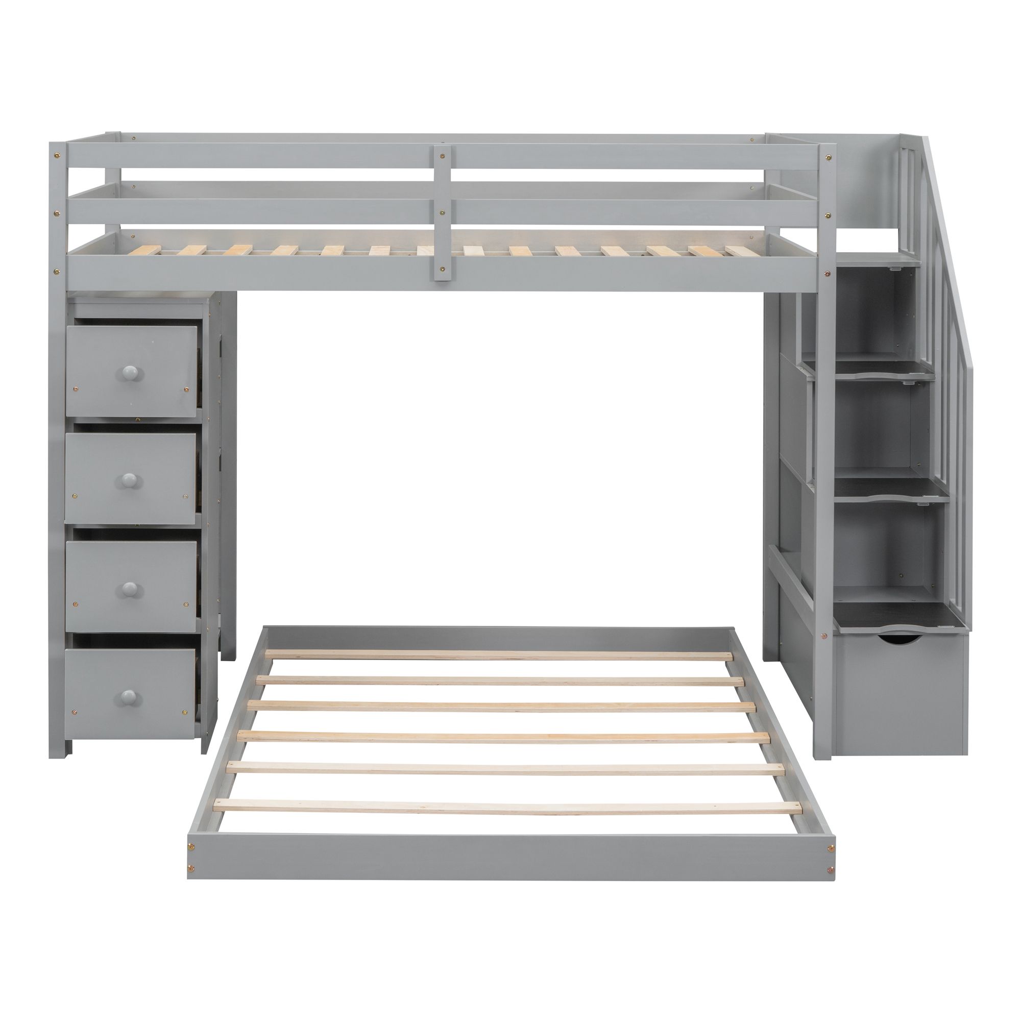 [Versatility galore] Four big drawers underneath the bed and the lateral shelves along with the storage stairs can provide enough space to stock your clothes, books, toys or any small items you like.You can also put some decorations on it to make the bed look even better. And the bottom bed can be pulled out for independent use.