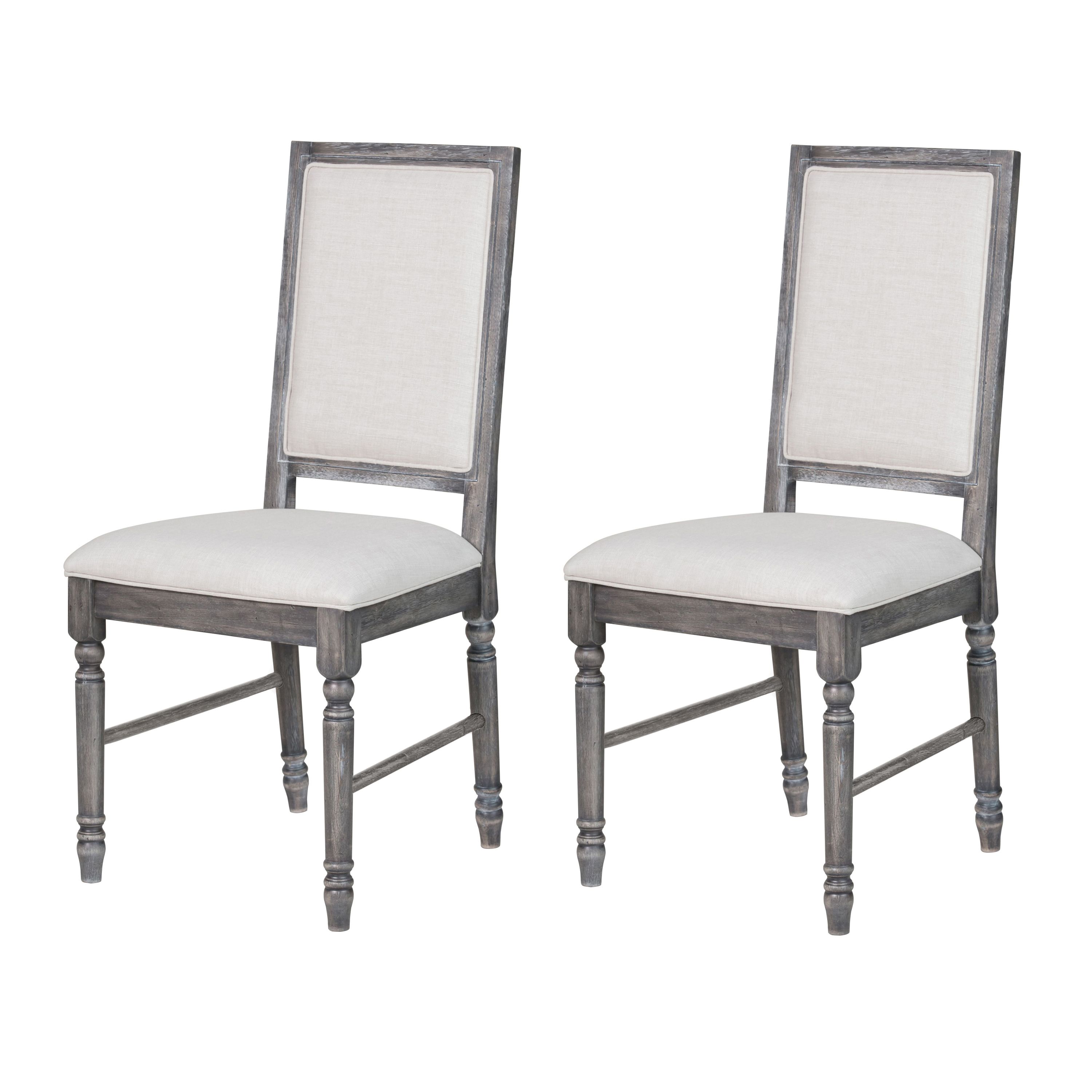 Transform your dining area or kitchen into a cozy retreat with these farmhouse-style side chairs, boasting cream linen upholstery and a weathered grey finish for a harmonious blend of elegance and rustic charm. Designed for comfort with a padded seat and crafted from quality wood, these chairs ensure durability and support for extended meals and conversations, enhancing both style and functionality in your space.