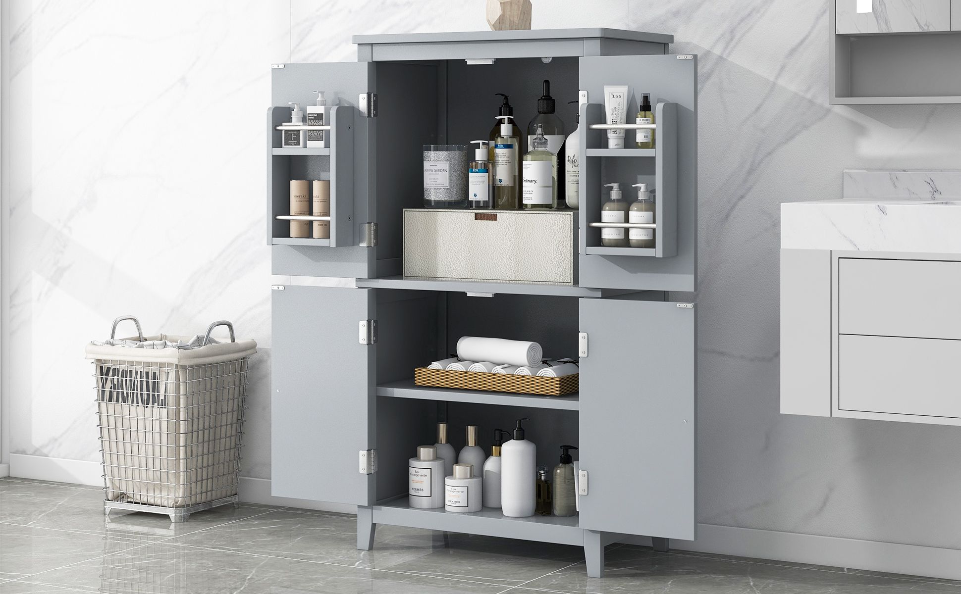 Plenty of Storage: This bathroom cabinet features an upper and a lower cabinet to provide ample space for your hairdryer, towels, cosmetics, shower items, and more.