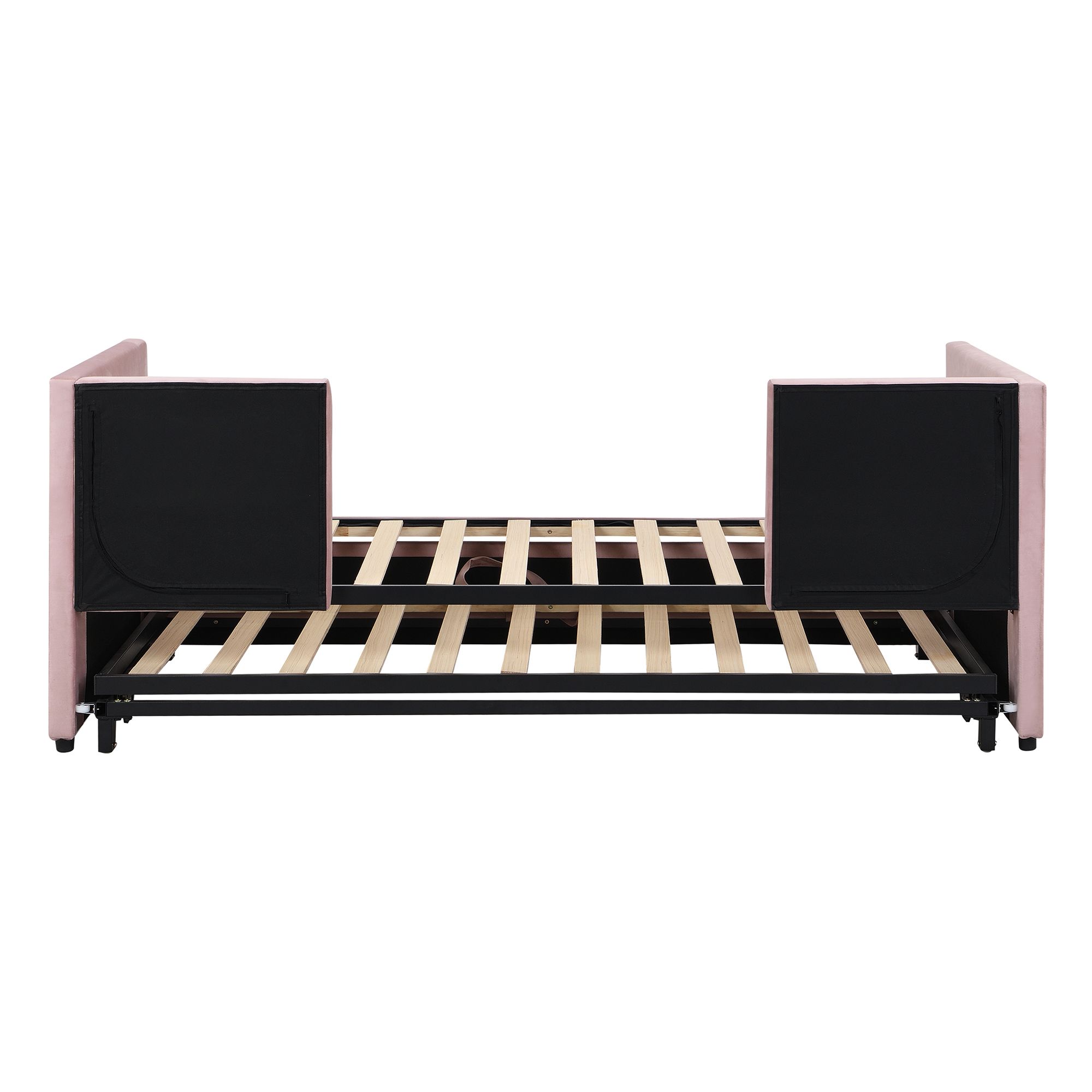 [Elegant design] Upholstered in carefully-selected velvet, in elegant gray/beige/pink, featured with backrest and two armrests, this daybed not only suits any home décor, but is timeless in its design. The soft backrest and armrests creates coziness, while the single color of the design creates versatility.