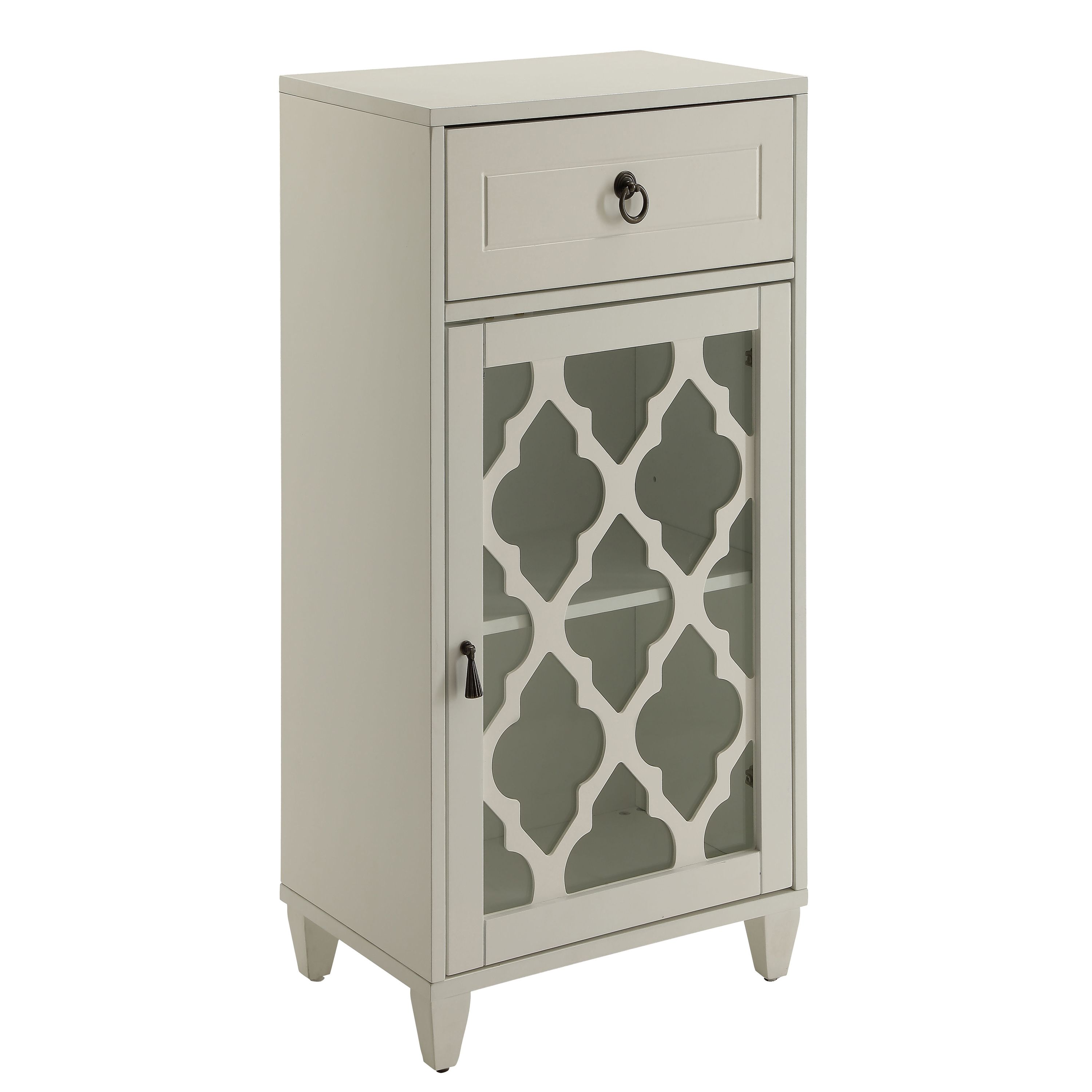 Elevate your home decor with this sleek cabinet featuring a glass door for showcasing your favorite decorative pieces and a convenient drawer for discreet storage, perfect for maintaining a clutter-free space. Its compact size and charming wooden tapered legs make it an ideal addition to any smaller living space, adding a touch of sophistication and functionality.