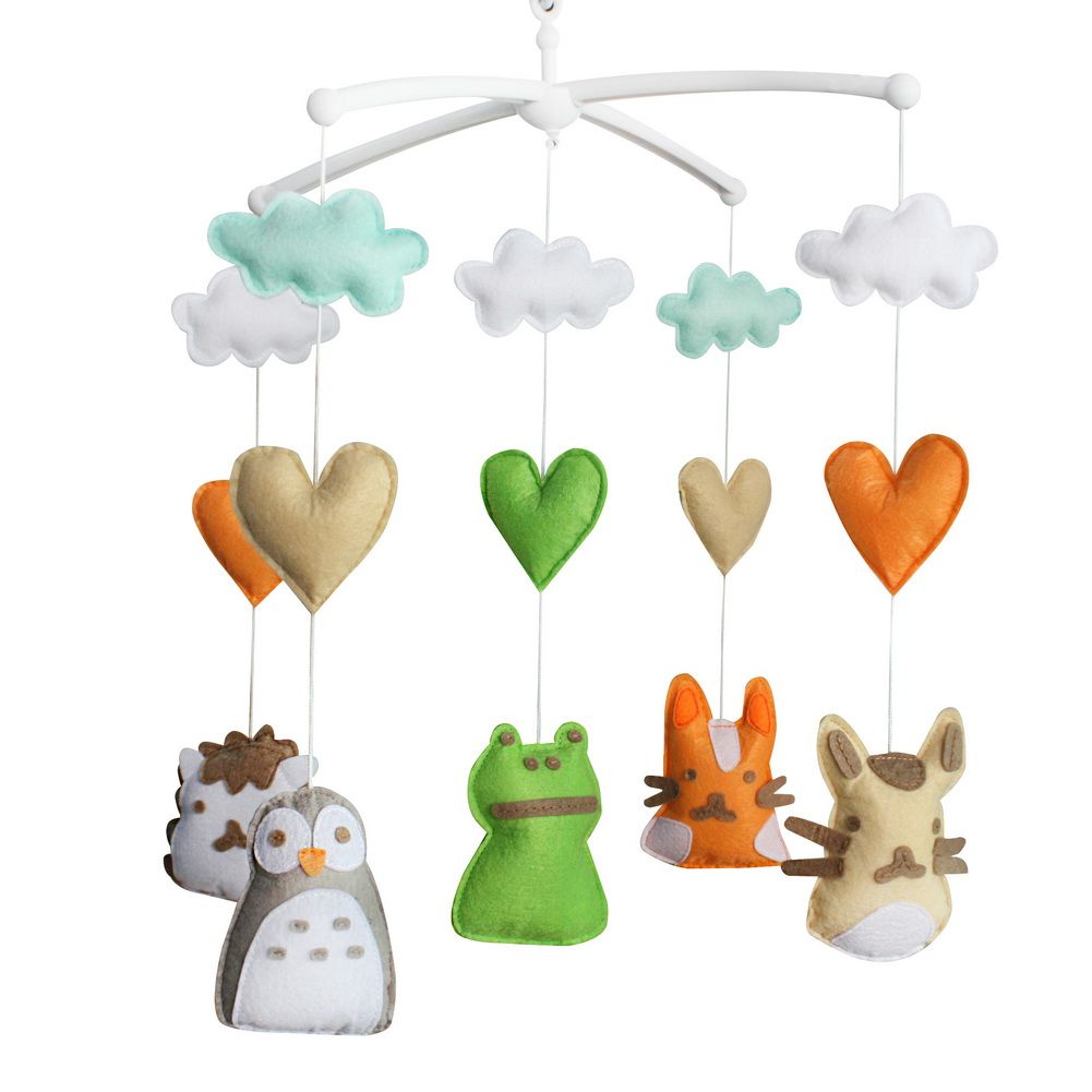 This handmade baby crib mobile plays light music to help your baby easily fall asleep. Easy operation and convenient to use; it will rotate while playing music. Each bed bell plays Only One soothing pure and light song. Keep baby calm and happy. It is an essential product for baby and nursery. Perfect for baby shower or mom-to-be gift for baby's nursery. Baby's nursery room decoration. The toys are made from nonwoven fabric.