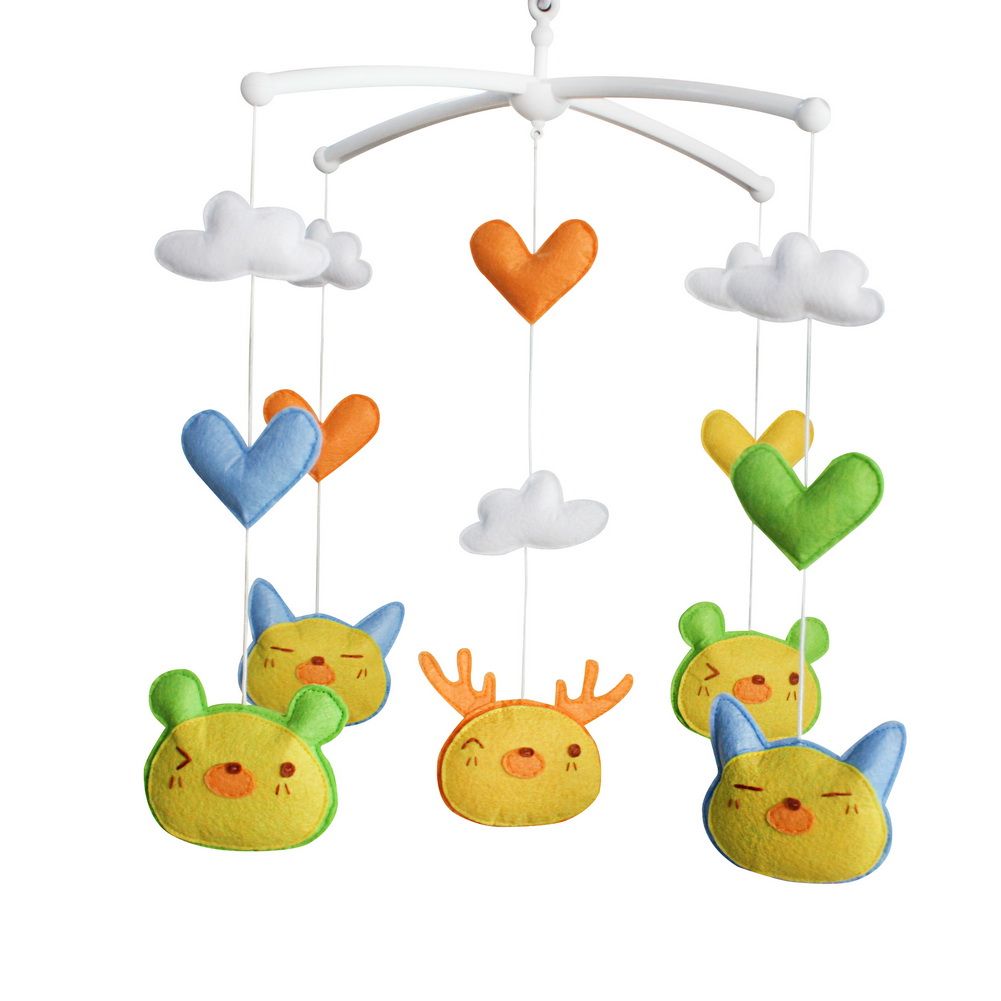 This handmade baby crib mobile plays light music to help your baby easily fall asleep. Easy operation and convenient to use; it will rotate while playing music. Each bed bell plays Only One soothing pure and light song. Keep baby calm and happy. It is an essential product for baby and nursery. Perfect for baby shower or mom-to-be gift for baby's nursery. Baby's nursery room decoration. The toys are made from nonwoven fabric.