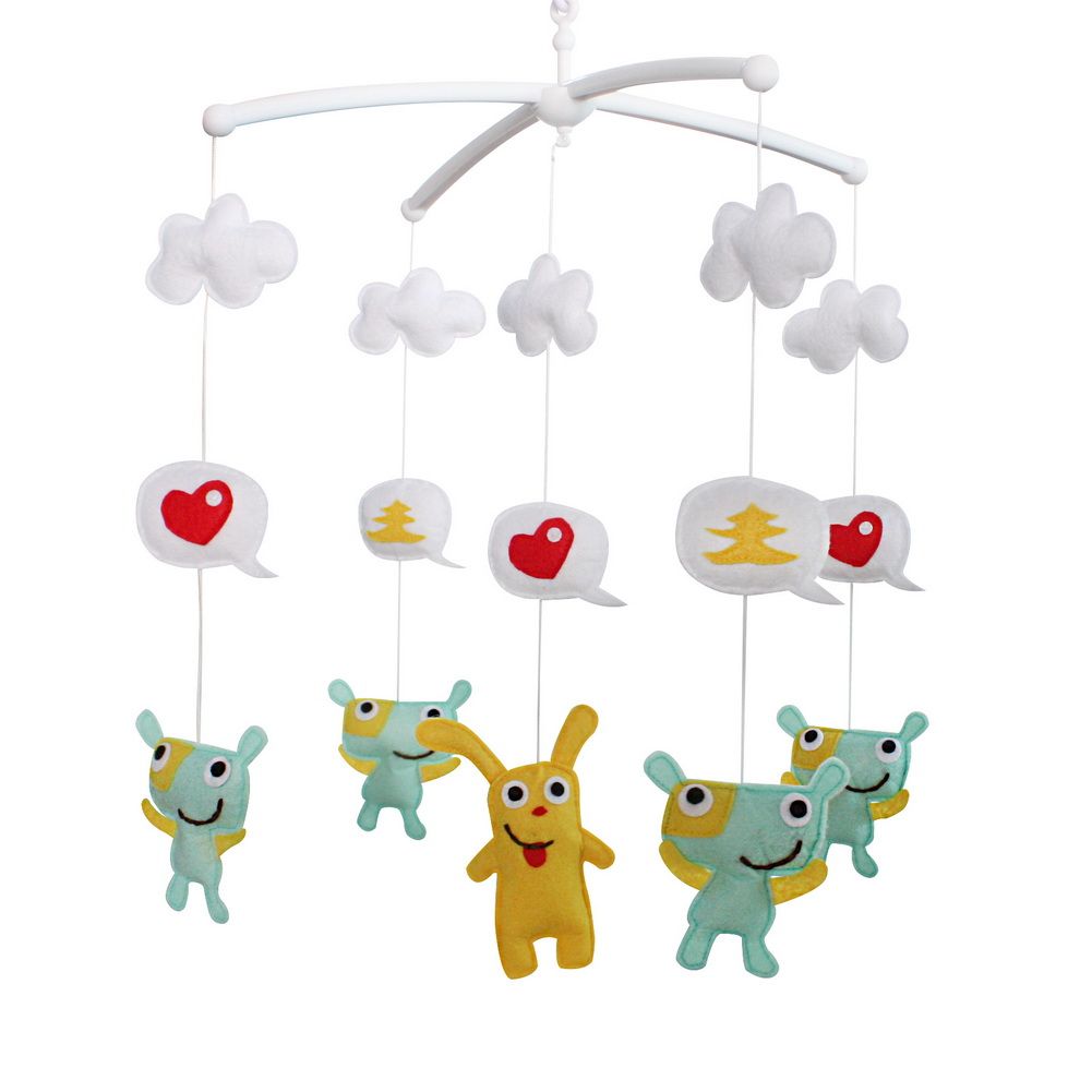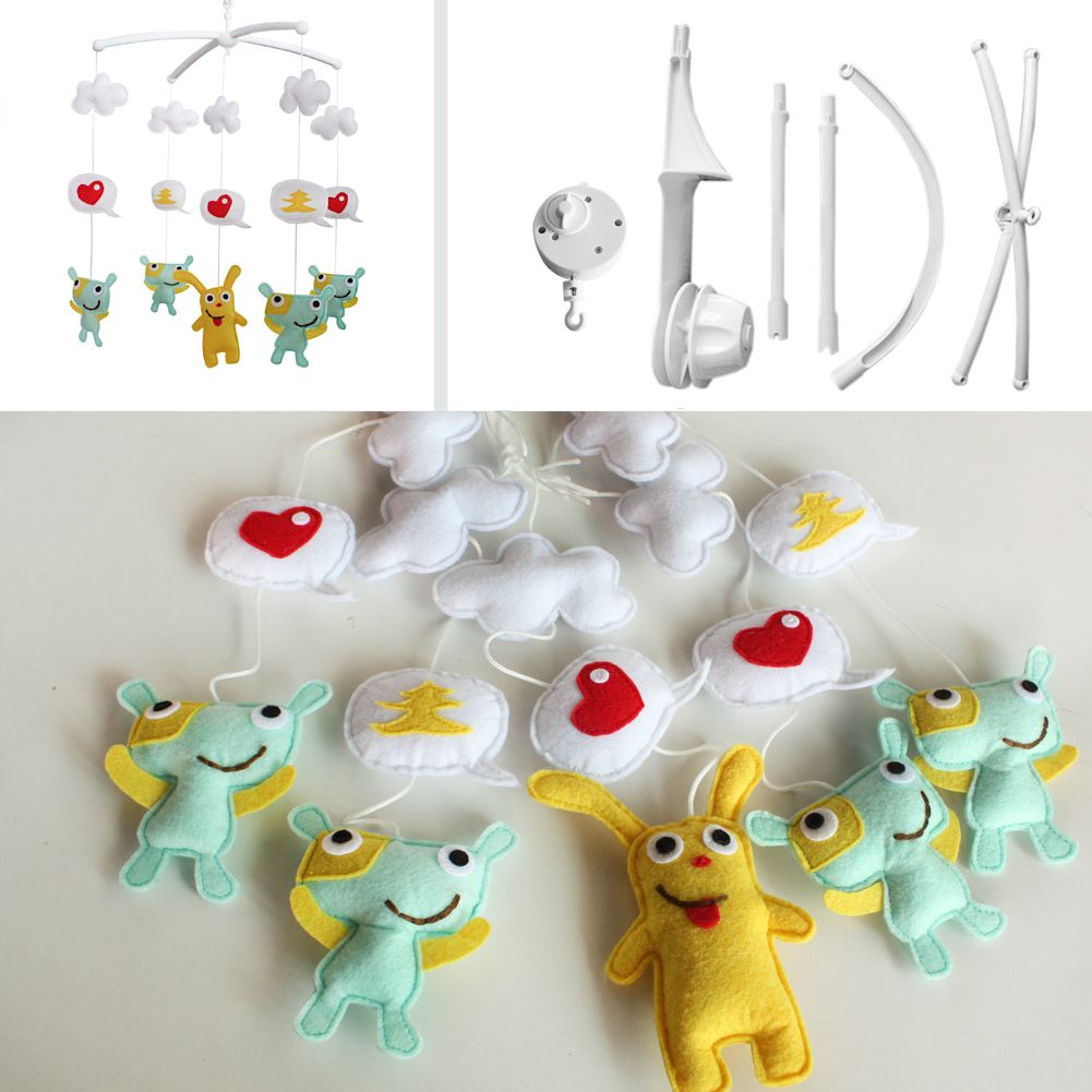 This handmade baby crib mobile plays light music to help your baby easily fall asleep. Easy operation and convenient to use; it will rotate while playing music. Each bed bell plays Only One soothing pure and light song. Keep baby calm and happy. It is an essential product for baby and nursery. Perfect for baby shower or momtobe gift for baby's nursery. Baby's nursery room decoration. The toys are made from nonwoven fabric.