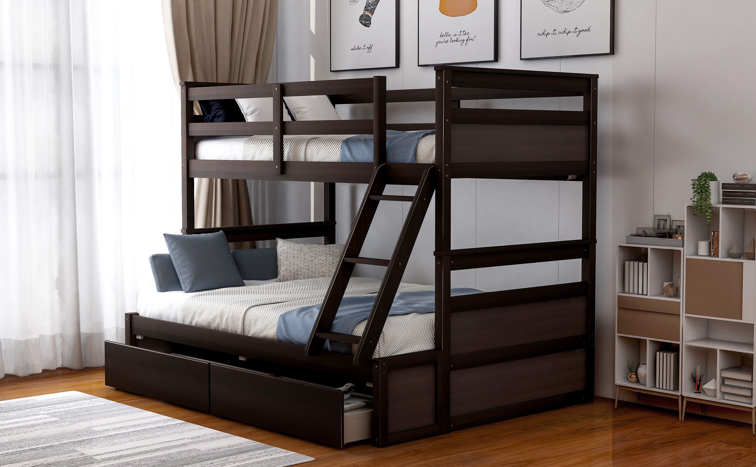[Maximized space] The bunk bed takes up minimal space for the spontaneous sleepover guest. Even better, a pair of drawers offers stowaway space for clothes and bedtime stories down below. Functional and aesthetic, this bunk bed will enhance any bedroom.