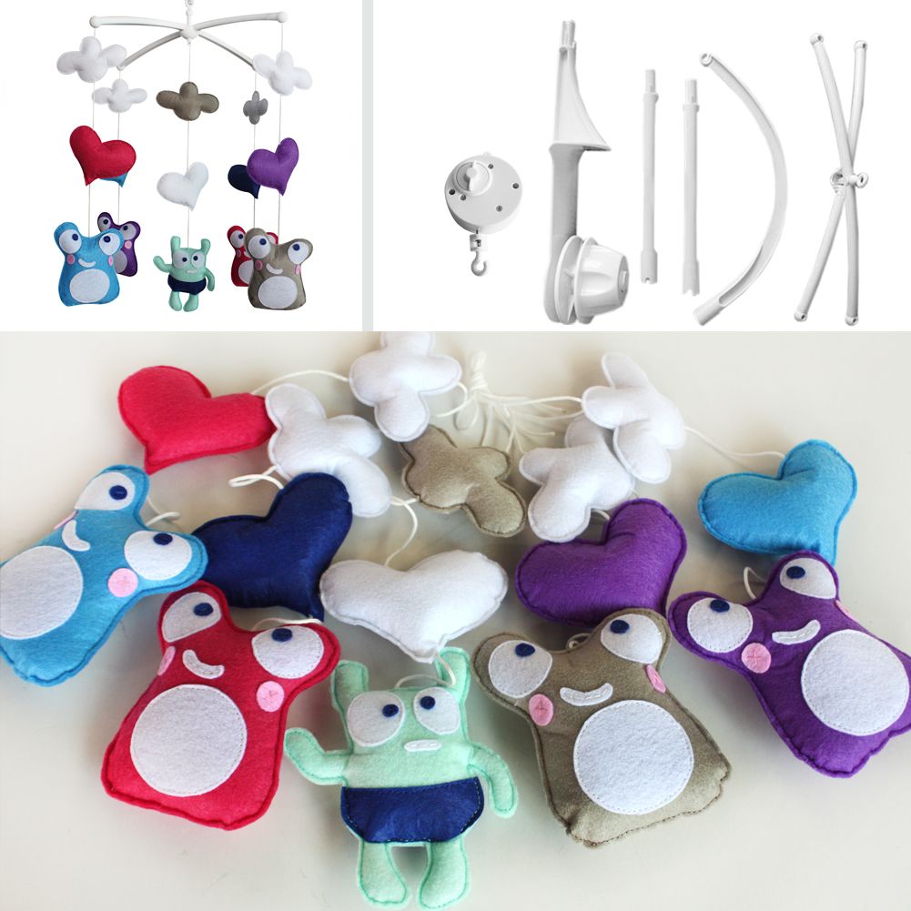 This handmade baby crib mobile plays light music to help your baby easily fall asleep. Easy operation and convenient to use; it will rotate while playing music. Each bed bell plays Only One soothing pure and light song. Keep baby calm and happy. It is an essential product for baby and nursery. Perfect for baby shower or momtobe gift for baby's nursery. Baby's nursery room decoration. The toys are made from nonwoven fabric.