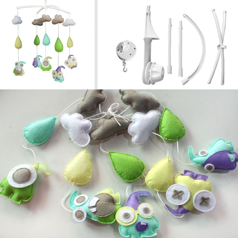 This handmade baby crib mobile plays light music to help your baby easily fall asleep. Easy operation and convenient to use; it will rotate while playing music. Each bed bell plays Only One soothing pure and light song. Keep baby calm and happy. It is an essential product for baby and nursery. Perfect for baby shower or momtobe gift for baby's nursery. Baby's nursery room decoration. The toys are made from nonwoven fabric.