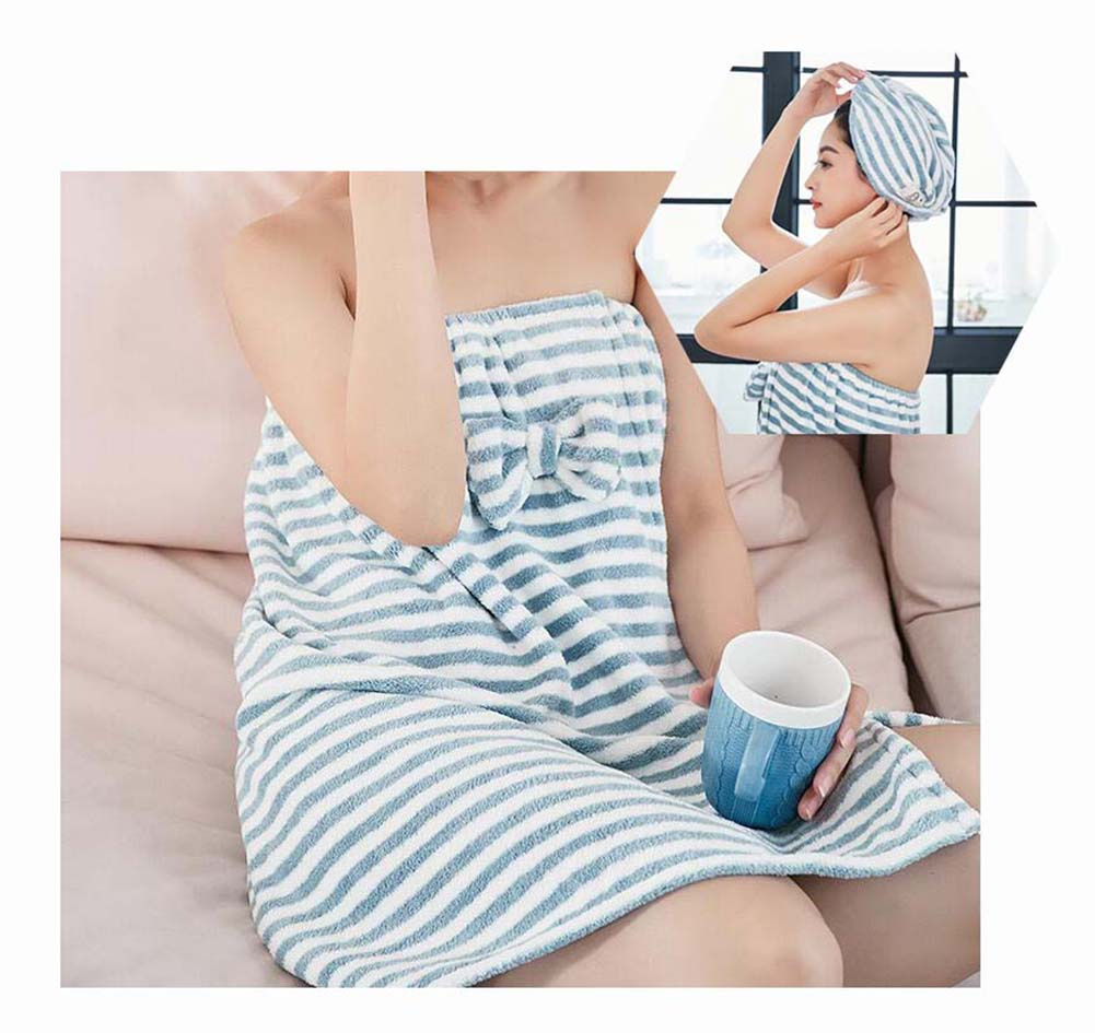 Hair Drying Turban and Bath Towel Wrap Skirt Microfiber Soft Towel Set Blue Stripes Hair Drying Turban and Bath Towel Wrap Skirt Microfiber Soft Towel Set Blue Stripes