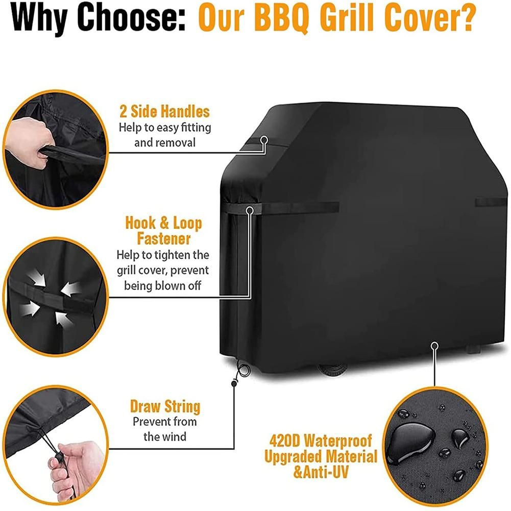 2.[Tear Resistant and Wind Resistant]- The grill hood has adjustable drawcords on the hood, with extra magic stickers added on both ends near the bottom. These bottom drawcords and magic stickers make the grill lid tighter. The grill hood will not be blown away by the wind.