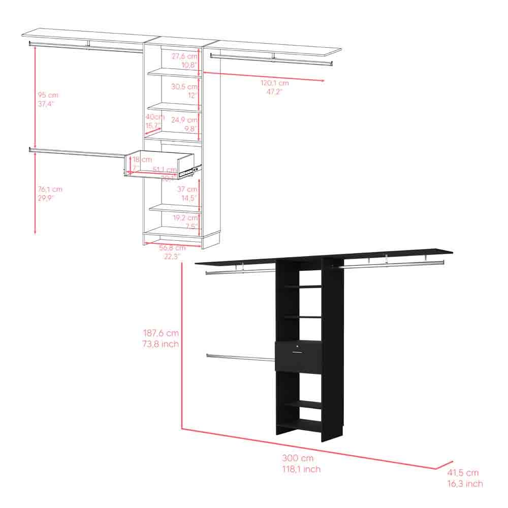 The Ashland closet system is the perfect option to organize your dream space, you will think of the best outfit ideas for every occasion, it includes five shelves, one drawer, and three hanging rods. Designed with dark walnut manufactured wood.Dimensions:Height: 73,8'Width: 118,1'Depth: 16,3'Furniture Type: Ready to assemble (full assembly required).Certifications: CARB phase II compliant – TSCA Title VI Compliant. Warranty: 1-year warranty coverage in wooden parts- 1-year warranty coverage in hardware pieces since its manufacturing date found in the lot number printed in the product box. Shipment details: Free shipping to the 48 contiguous states - delivery time: Between 2 and 5 days depending on the customer's location, season and weather factors.Other details: This product does not include decorative or background elements; Check that the box is in good condition, well packed and check with the help of the manual that the corresponding parts have been included; For more information regarding warranty, shipment details, cancellations, returns & replacement parts go to the bottom section of our website to learn more; Installation & Assembly Instructions included.