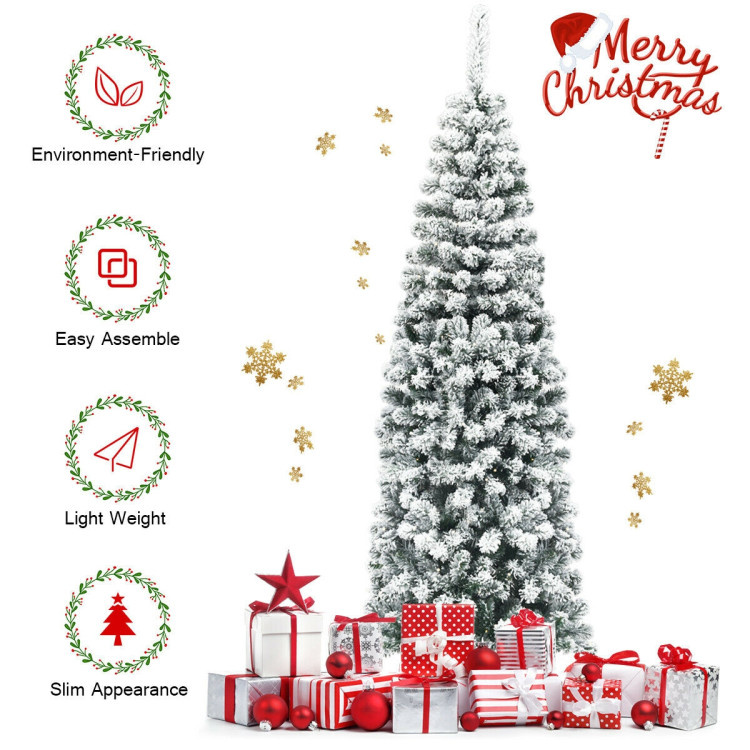 500 branch tips create a full-bodied look and help simulate a real Christmas treeSnow flocked leaves create a unique wintry feelSlim pencil design is ideal for display in corners or areas with limited spaceHigh-quality PVC branch tips with exquisite craftsmanship will not fall off or fade easilySturdy metal stand is stable and breakage-resistantFoldable metal stand helps facilitate storageEasy to set up and fluff with hinged designEye-catching addition for homes, shops, restaurants, etc.