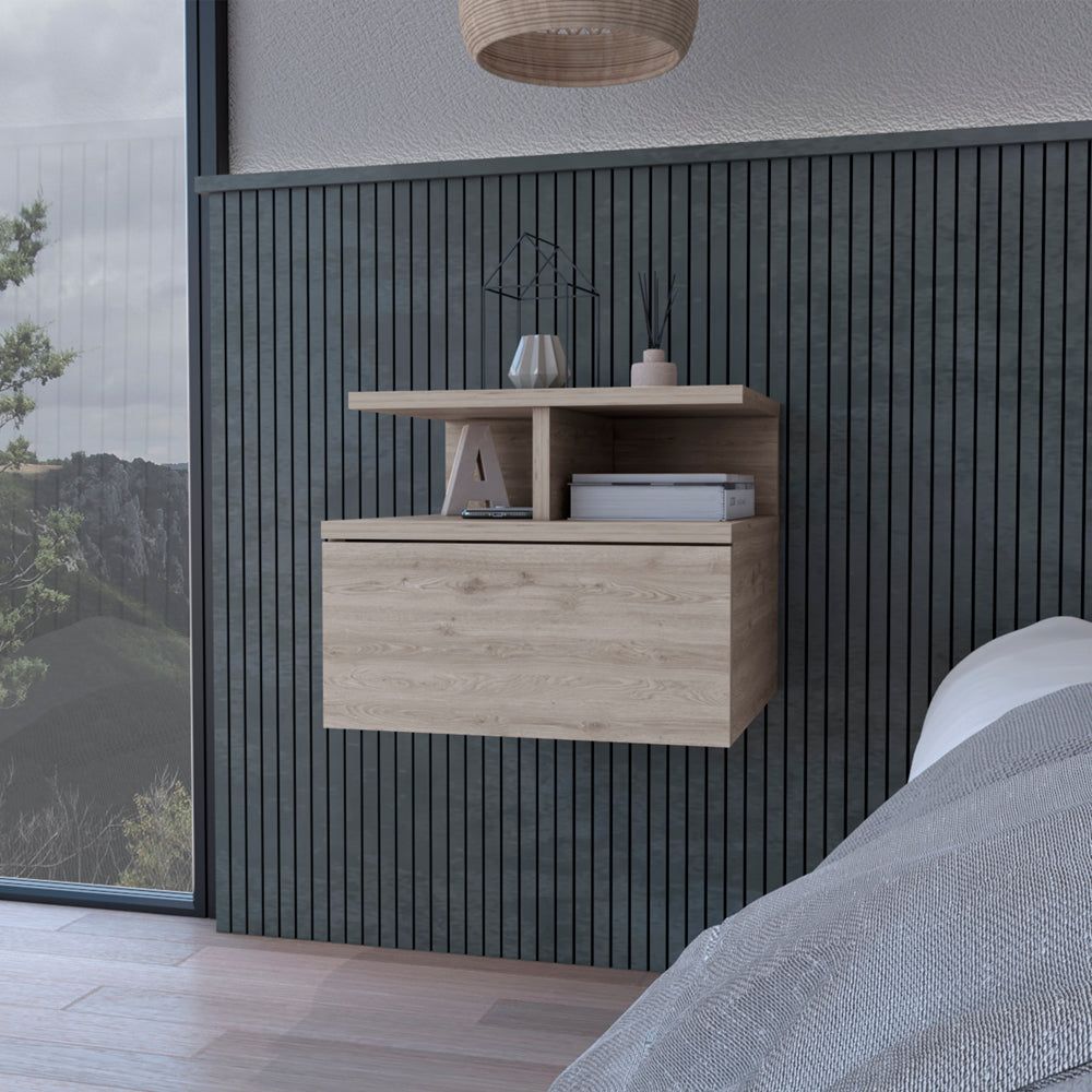 Introducing the Flopini Floating Nightstand, a contemporary masterpiece designed to elevate your bedroom aesthetics. Crafted for eassy wall assembly, it brings a modern touch to your space. Its single drawer, measuring 4.4" H x 10.5" W x 11.5" D, coupled with a top shelf of 14" W x 10.8" D, offers an organized home for your favorite books and accessories. Available in elegant finishes of black, white, dark walnut, macadamia, light gray, concrete gray or smokey oak, this nightstand is more than a storage solution; it's a statement of style, crafted from high-quality manufactured wood.Dimensions: Height: 11,6"Width: 14,1" Depth: 13,2"Furniture Type: Ready to assemble (full assembly required). Certifications: CARB phase II compliant – TSCA Title VI Compliant. Warranty: 1-year warranty coverage in wooden parts- 1-year warranty coverage in hardware pieces since its manufacturing date is found in the lot number printed in the product box. Shipment details: Free shipping to the 48 contiguous states - delivery time: Between 2 and 5 days depending on the customer's location- season- and weather factors.Other details: This product does not include decorative or background elements; Check that the box is in good condition- and well packed- and check with the help of the manual that the corresponding parts have been included; For more information regarding warranty- shipment details- cancellations- returns & replacement parts go to the bottom section of our website to learn more; Installation & Assembly Instructions included.