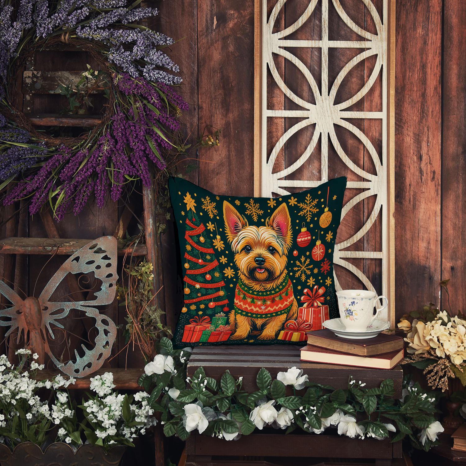 Throw Pillow featuring breed specific Norwich Terrier artwork. Celebrate Christmas with this Christmas Pillow. Add a touch of vibrancy and comfort to your outdoor seating with Caroline's Treasures Fabric Decorative Pillow. Measuring approximately 14 inches by 14 inches, this outdoor pillow is crafted to elevate the appeal of your patio furniture, infusing it with vivid color and artistic flair. The pillow includes a 100% Polyester Fabric sham filled with a quality pillow form to provide superior comfort. Innovatively made from our brand new material, specifically woven for its water resistance, this pillow is designed for durability. The soft canvas fabric offers versatility in use, fit for your indoor couch or your outdoor patio, porch, or veranda. The fabric is dyed with colorfast dyes built for resilience against weather conditions, ensuring the pillow retains its beauty over time. Constructed by sewing three fabric pieces to create a sham, the polyester insert is then nestled inside to form the pillow, resulting in an overstuffed pillow that maintains its shape. Both the sham and the pillow insert are proudly made in the United States. As the pillows are handcrafted, there may be minor variations in size, further enhancing their unique charm. Experience comfort in style with Caroline's Treasures Fabric Decorative Pillow.