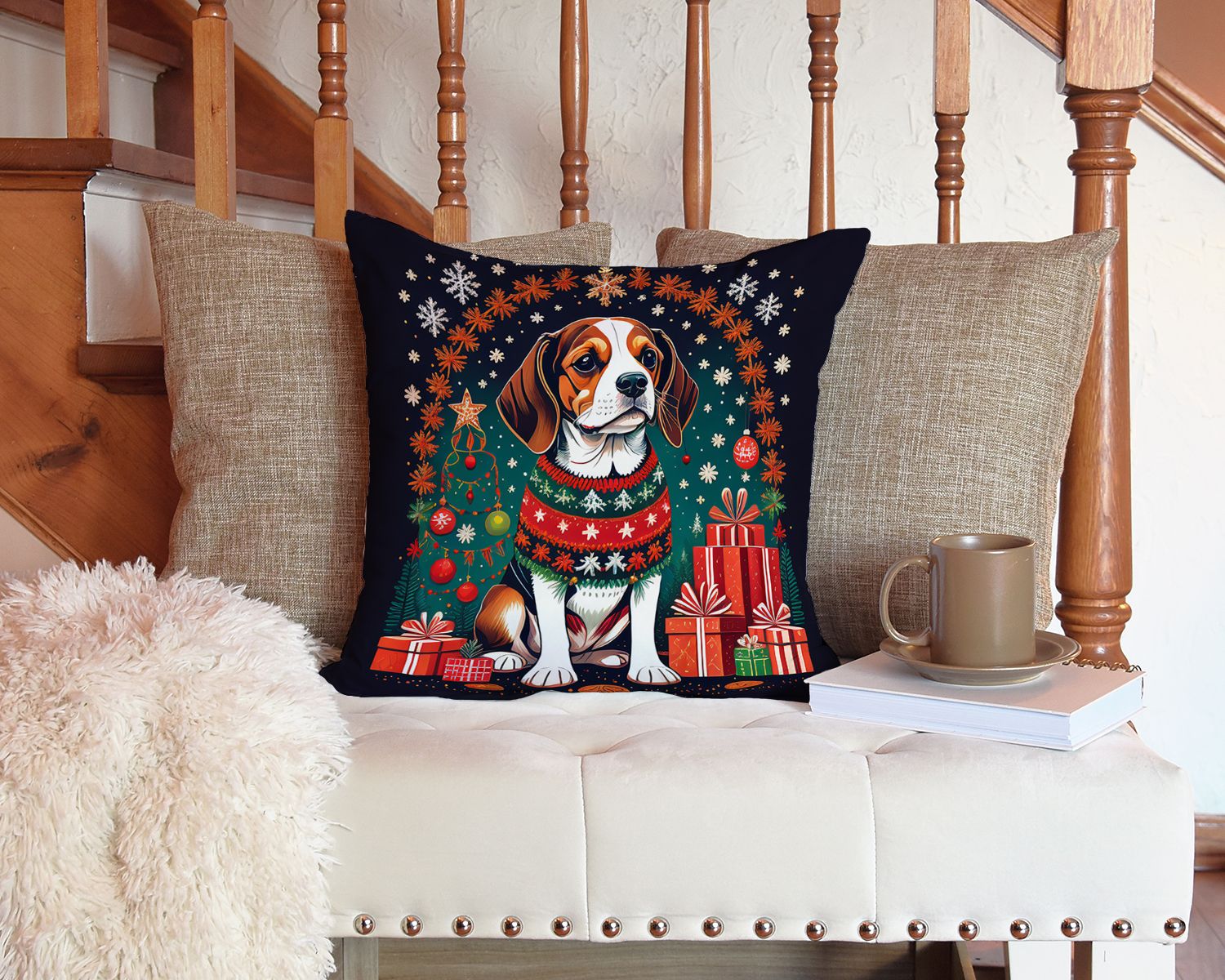 Throw Pillow featuring breed specific Beagle artwork. Celebrate Christmas with this Christmas Pillow. Add a touch of vibrancy and comfort to your outdoor seating with Caroline's Treasures Fabric Decorative Pillow. Measuring approximately 14 inches by 14 inches, this outdoor pillow is crafted to elevate the appeal of your patio furniture, infusing it with vivid color and artistic flair. The pillow includes a 100% Polyester Fabric sham filled with a quality pillow form to provide superior comfort. Innovatively made from our brand new material, specifically woven for its water resistance, this pillow is designed for durability. The soft canvas fabric offers versatility in use, fit for your indoor couch or your outdoor patio, porch, or veranda. The fabric is dyed with colorfast dyes built for resilience against weather conditions, ensuring the pillow retains its beauty over time. Constructed by sewing three fabric pieces to create a sham, the polyester insert is then nestled inside to form the pillow, resulting in an overstuffed pillow that maintains its shape. Both the sham and the pillow insert are proudly made in the United States. As the pillows are handcrafted, there may be minor variations in size, further enhancing their unique charm. Experience comfort in style with Caroline's Treasures Fabric Decorative Pillow.