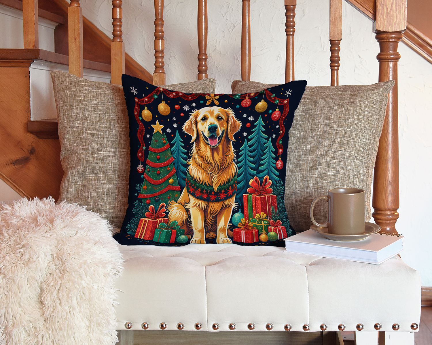 Throw Pillow featuring breed specific Golden Retriever artwork. Celebrate Christmas with this Christmas Pillow. Add a touch of vibrancy and comfort to your outdoor seating with Caroline's Treasures Fabric Decorative Pillow. Measuring approximately 14 inches by 14 inches, this outdoor pillow is crafted to elevate the appeal of your patio furniture, infusing it with vivid color and artistic flair. The pillow includes a 100% Polyester Fabric sham filled with a quality pillow form to provide superior comfort. Innovatively made from our brand new material, specifically woven for its water resistance, this pillow is designed for durability. The soft canvas fabric offers versatility in use, fit for your indoor couch or your outdoor patio, porch, or veranda. The fabric is dyed with colorfast dyes built for resilience against weather conditions, ensuring the pillow retains its beauty over time. Constructed by sewing three fabric pieces to create a sham, the polyester insert is then nestled inside to form the pillow, resulting in an overstuffed pillow that maintains its shape. Both the sham and the pillow insert are proudly made in the United States. As the pillows are handcrafted, there may be minor variations in size, further enhancing their unique charm. Experience comfort in style with Caroline's Treasures Fabric Decorative Pillow.