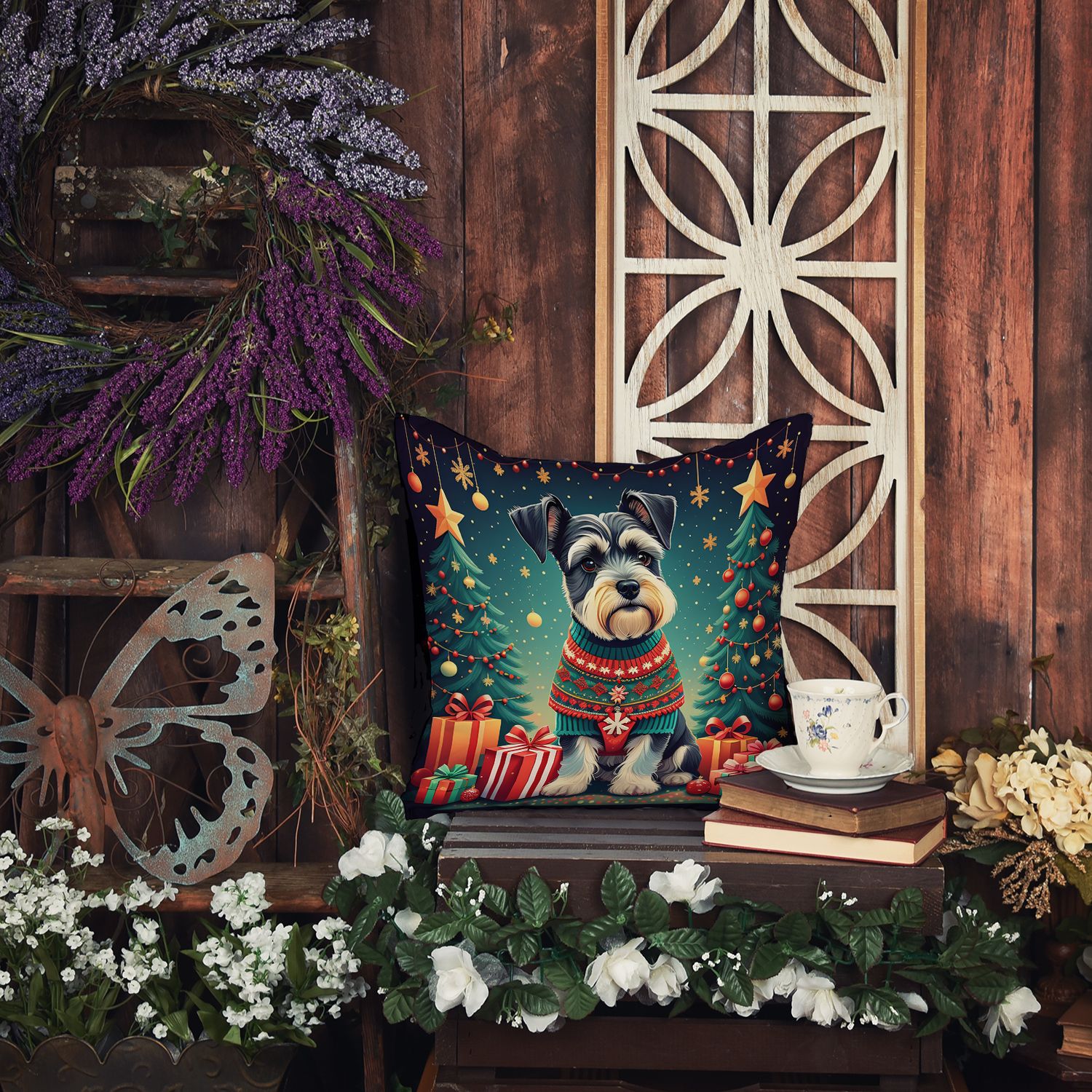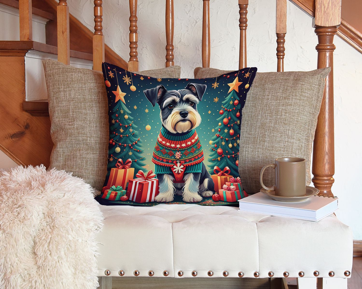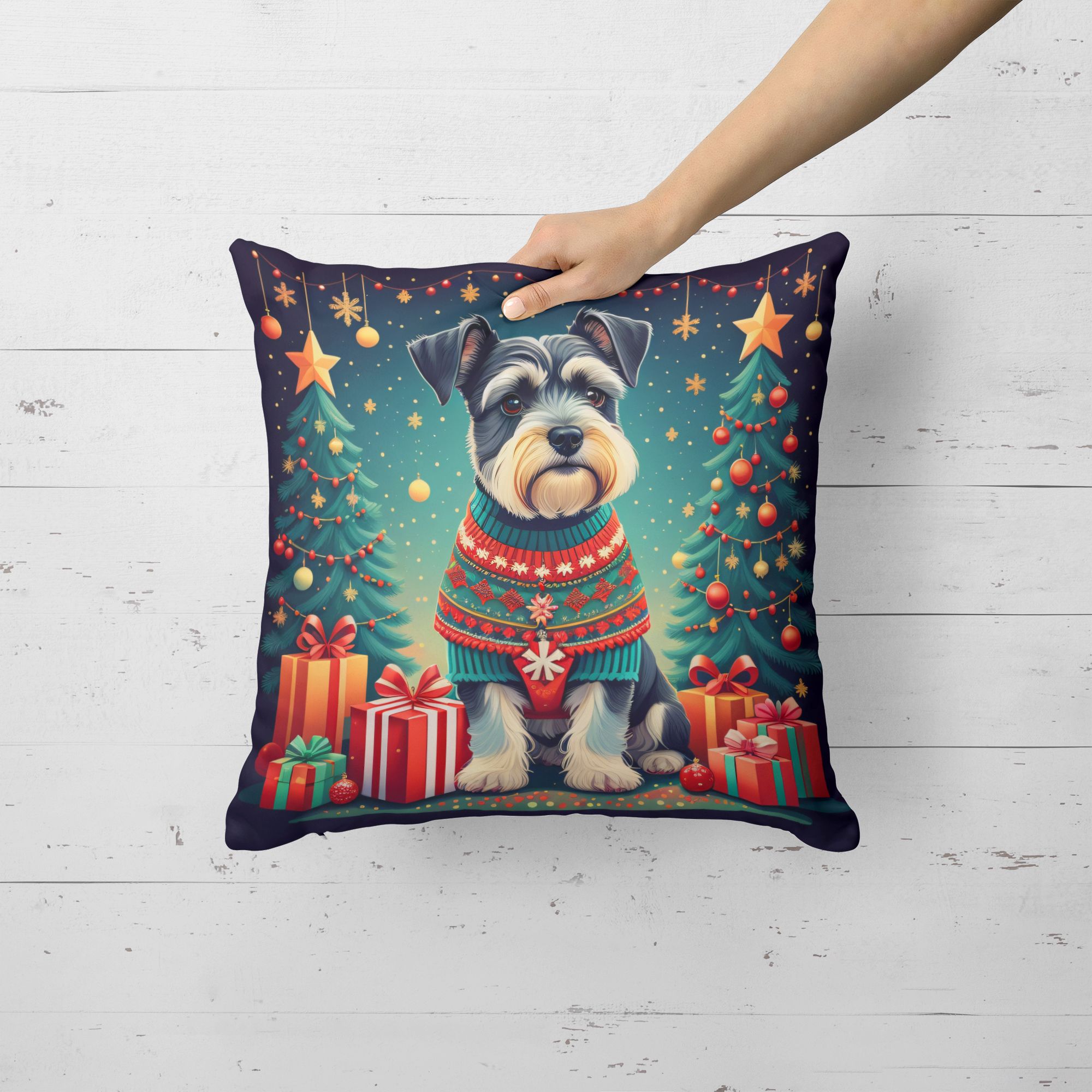 Throw Pillow featuring breed specific Schnauzer artwork. Celebrate Christmas with this Christmas Pillow. Add a touch of vibrancy and comfort to your outdoor seating with Caroline's Treasures Fabric Decorative Pillow. Measuring approximately 14 inches by 14 inches, this outdoor pillow is crafted to elevate the appeal of your patio furniture, infusing it with vivid color and artistic flair. The pillow includes a 100% Polyester Fabric sham filled with a quality pillow form to provide superior comfort. Innovatively made from our brand new material, specifically woven for its water resistance, this pillow is designed for durability. The soft canvas fabric offers versatility in use, fit for your indoor couch or your outdoor patio, porch, or veranda. The fabric is dyed with colorfast dyes built for resilience against weather conditions, ensuring the pillow retains its beauty over time. Constructed by sewing three fabric pieces to create a sham, the polyester insert is then nestled inside to form the pillow, resulting in an overstuffed pillow that maintains its shape. Both the sham and the pillow insert are proudly made in the United States. As the pillows are handcrafted, there may be minor variations in size, further enhancing their unique charm. Experience comfort in style with Caroline's Treasures Fabric Decorative Pillow.