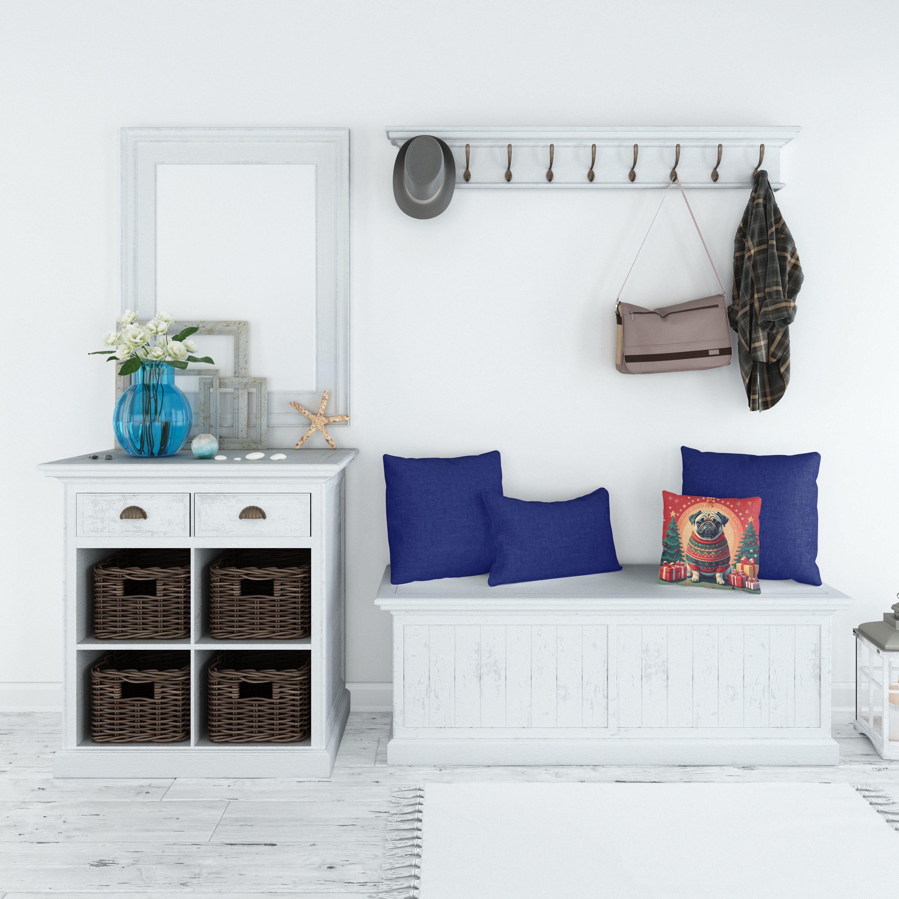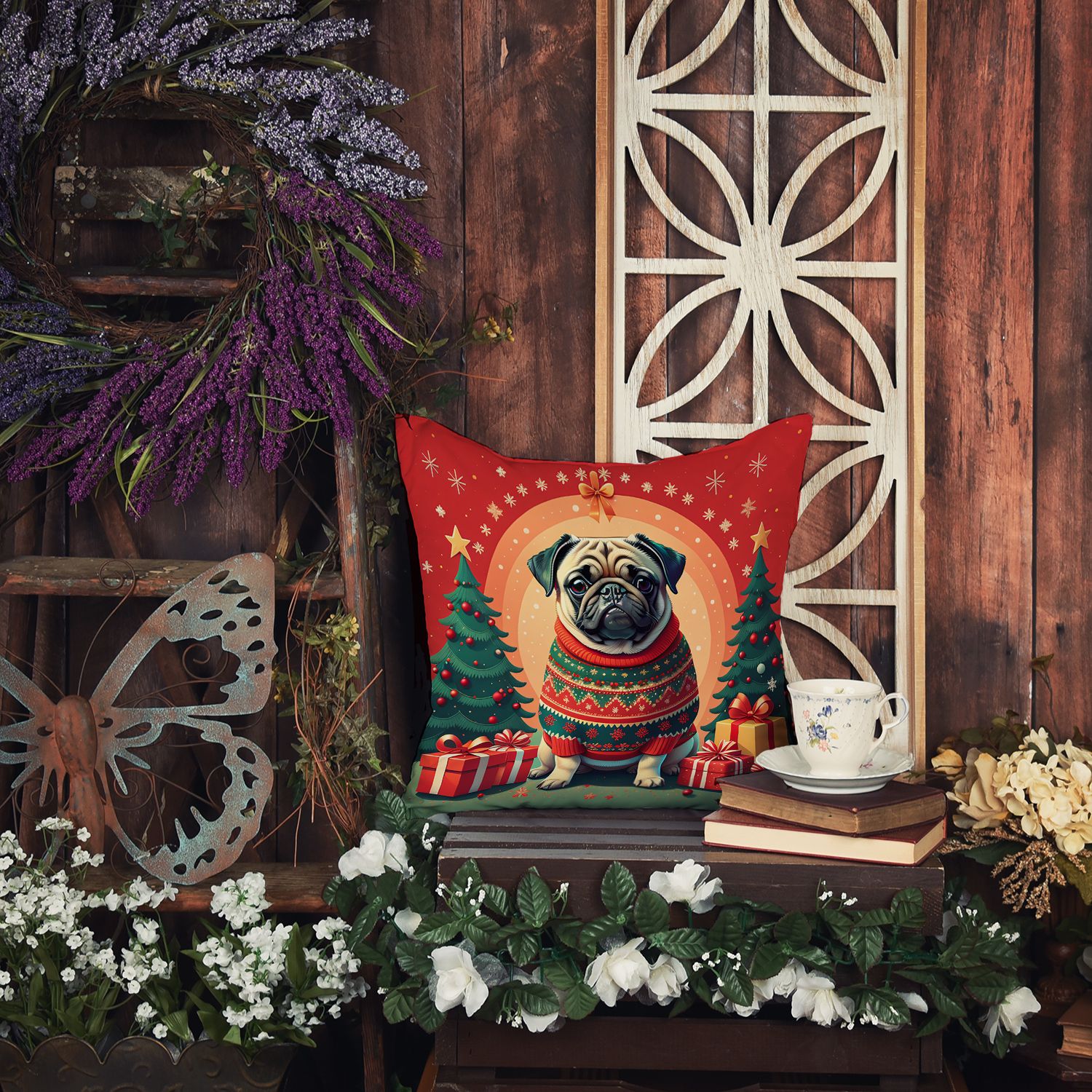 Throw Pillow featuring breed specific Pug artwork. Celebrate Christmas with this Christmas Pillow. Add a touch of vibrancy and comfort to your outdoor seating with Caroline's Treasures Fabric Decorative Pillow. Measuring approximately 14 inches by 14 inches, this outdoor pillow is crafted to elevate the appeal of your patio furniture, infusing it with vivid color and artistic flair. The pillow includes a 100% Polyester Fabric sham filled with a quality pillow form to provide superior comfort. Innovatively made from our brand new material, specifically woven for its water resistance, this pillow is designed for durability. The soft canvas fabric offers versatility in use, fit for your indoor couch or your outdoor patio, porch, or veranda. The fabric is dyed with colorfast dyes built for resilience against weather conditions, ensuring the pillow retains its beauty over time. Constructed by sewing three fabric pieces to create a sham, the polyester insert is then nestled inside to form the pillow, resulting in an overstuffed pillow that maintains its shape. Both the sham and the pillow insert are proudly made in the United States. As the pillows are handcrafted, there may be minor variations in size, further enhancing their unique charm. Experience comfort in style with Caroline's Treasures Fabric Decorative Pillow.