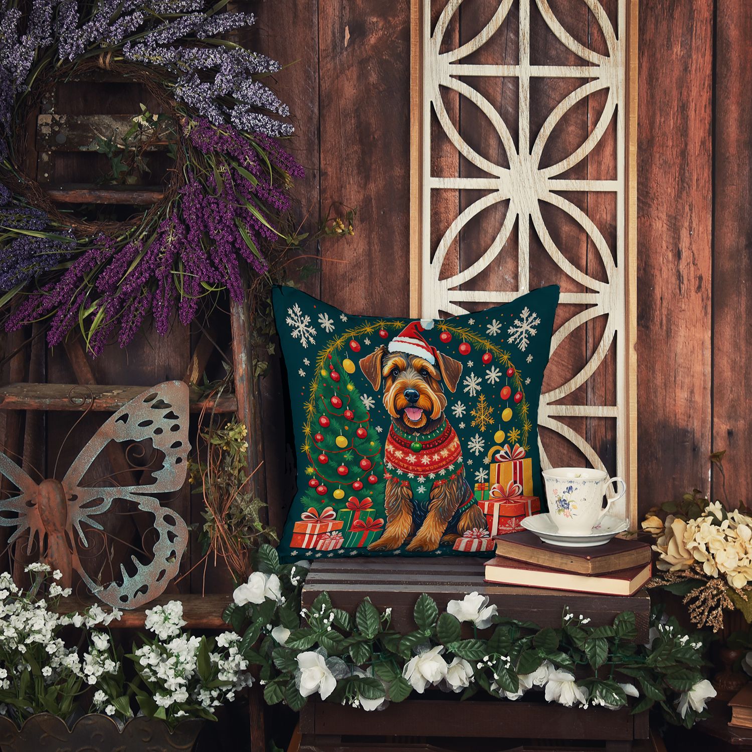 Throw Pillow featuring breed specific Airedale Terrier artwork. Celebrate Christmas with this Christmas Pillow. Add a touch of vibrancy and comfort to your outdoor seating with Caroline's Treasures Fabric Decorative Pillow. Measuring approximately 14 inches by 14 inches, this outdoor pillow is crafted to elevate the appeal of your patio furniture, infusing it with vivid color and artistic flair. The pillow includes a 100% Polyester Fabric sham filled with a quality pillow form to provide superior comfort. Innovatively made from our brand new material, specifically woven for its water resistance, this pillow is designed for durability. The soft canvas fabric offers versatility in use, fit for your indoor couch or your outdoor patio, porch, or veranda. The fabric is dyed with colorfast dyes built for resilience against weather conditions, ensuring the pillow retains its beauty over time. Constructed by sewing three fabric pieces to create a sham, the polyester insert is then nestled inside to form the pillow, resulting in an overstuffed pillow that maintains its shape. Both the sham and the pillow insert are proudly made in the United States. As the pillows are handcrafted, there may be minor variations in size, further enhancing their unique charm. Experience comfort in style with Caroline's Treasures Fabric Decorative Pillow.
