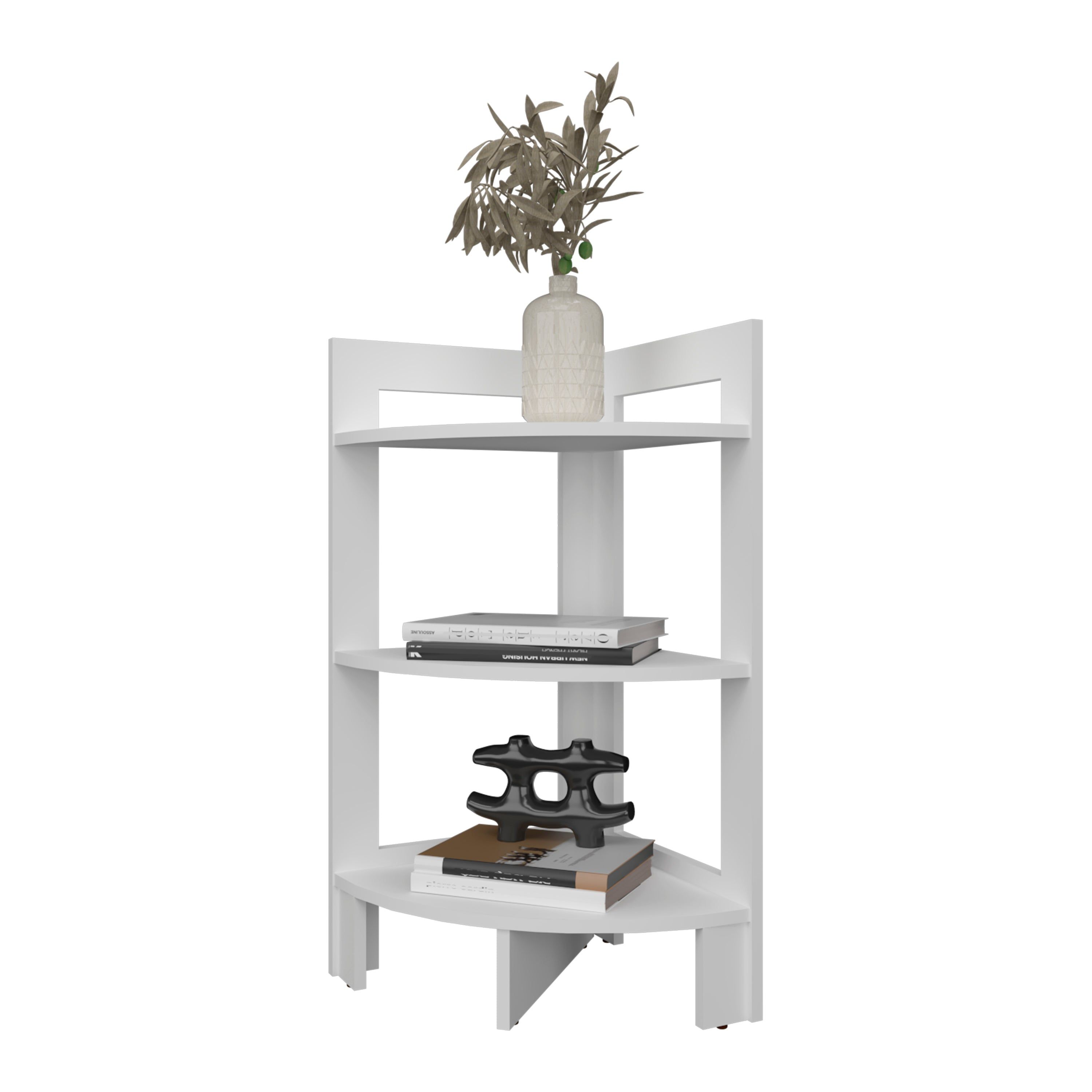 The Corner Table Sharon is a modern and versatile corner shelf designed to enhance any living room with its sleek, space-saving structure. This three-tier corner table is made from durable, white manufactured wood and offers ample space for displaying décor, books, plants, and more. With an upper shelf (4.7"H x 20.6" W), a middle shelf (10.4"H x 20.6" W), and a lower shelf (10.4"H x 20.6" W), this piece is both functional and stylish, perfect for adding storage without compromising on aesthetics.Dimensions: Height: 31.7'Width: 15.2' Depth: 15.2'Furniture Type: Ready to assemble (full assembly required).Certifications: CARB phase II compliant – TSCA Title VI Compliant.Warranty: 1-year warranty coverage in wooden parts- 1-year warranty coverage in hardware pieces since its manufacturing date is found in the lot number printed in the product box.Shipment details: Free shipping to the 48 contiguous states - delivery time: Between 2 and 5 days, depending on the customer's location, season, and weather factors.Other details: This product does not include decorative or background elements; Check that the box is in good condition and well packed and check with the help of the manual that the corresponding parts have been included; For more information regarding warranty, shipment details, cancellations, returns & replacement parts go to the bottom section of our website to learn more; Installation & Assembly Instructions included.