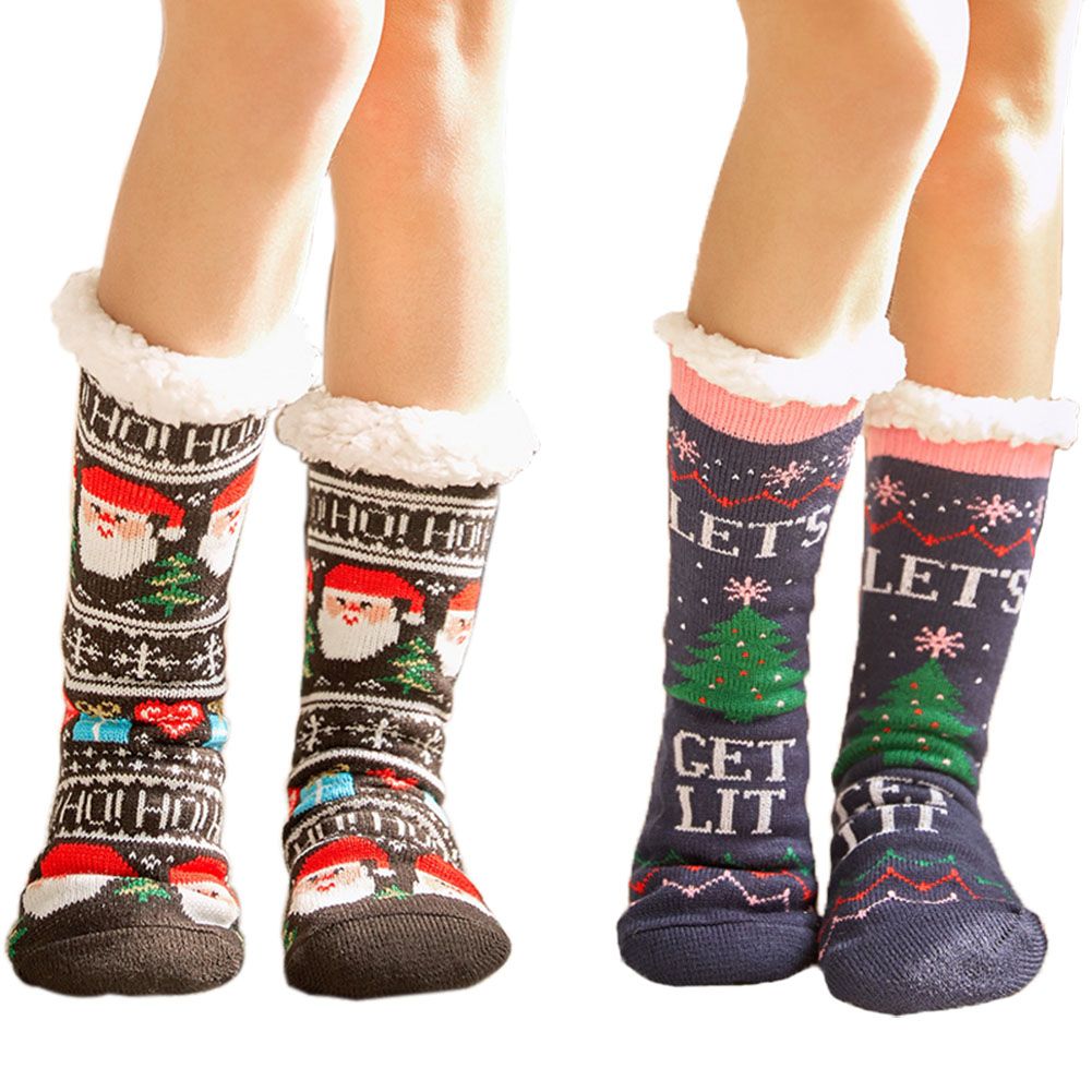 2 Pairs Thicken Knit Cozy Warm Fuzzy Slipper Socks With Non-slip Grippers, Santa and Christmas Tree