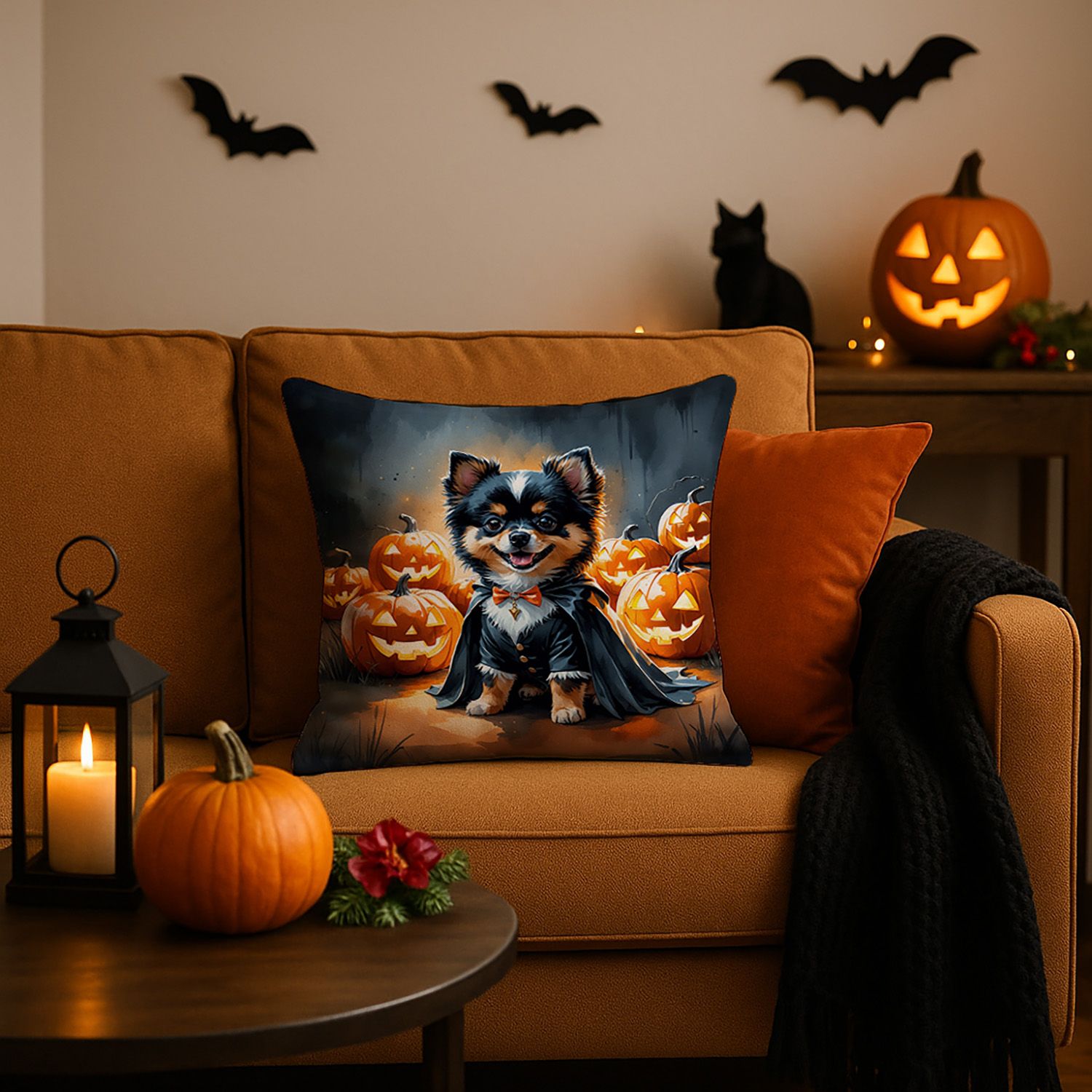 Throw Pillow featuring breed specific Pomeranian artwork. Celebrate Halloween with this Halloween Pillow. Revitalize your outdoor or indoor living space with Caroline's Treasures 18x18 Fabric Decorative Pillow. With a generously sized dimension of approximately 18 inches by 18 inches, this pillow makes a comfortable and aesthetic addition to any seating area. Made from a unique, water-resistant material developed by Caroline's Treasures, the pillow sham is 100% polyester fabric that's durable and ready to weather any condition. Its vibrant, full-color artwork will not fade over time as it is dyed with color-fast dyes. Whether you place it on your patio furniture, porch, veranda, or indoor couch, its soft canvas fabric ensures a cozy experience. The pillow is handcrafted in the United States, featuring a sham created from three pieces of fabric and a polyester insert for enduring shape and overstuffed comfort. Despite being robustly built to endure the outdoors, it is as soft and snug as your favorite indoor cushions. Please note, as all our pillows are handmade, sizes may vary slightly, adding to the charm of this unique decorative item.