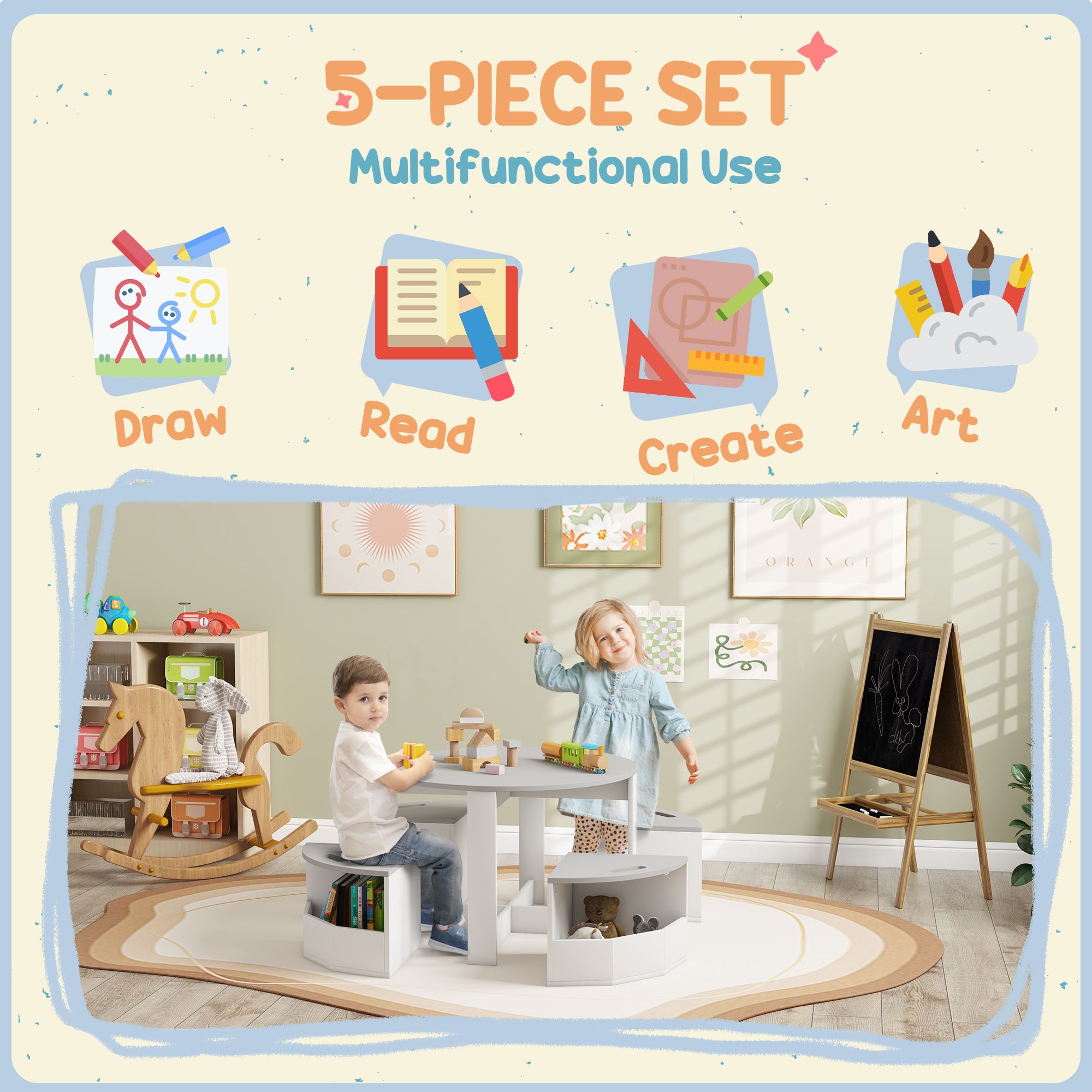 Enjoy creative, clutter-free playtimes. Discover the joy of space-saving design with the Qaba Kids Table and Chair Set. This 5-piece baby chair set tucks chairs neatly under the table and includes hidden storage under each seat. Suitable for any play area, this small table and chairs are a delightful addition to any nursery, daycare, or home.