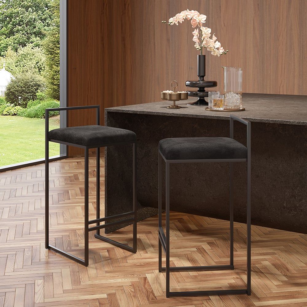 Add a touch of modern sophistication to your kitchen or bar with this set of two 660mm modern counter stools. The luxurious black velvet upholsteries are designed with a low backrest, combining elegance and comfort. With a foam-padded seat, it will be cozy, while the legs in sleek black metal provide a strong and stable structure. Perfectly suited for modern interiors, the stools give a facelift to your dining or entertaining area.