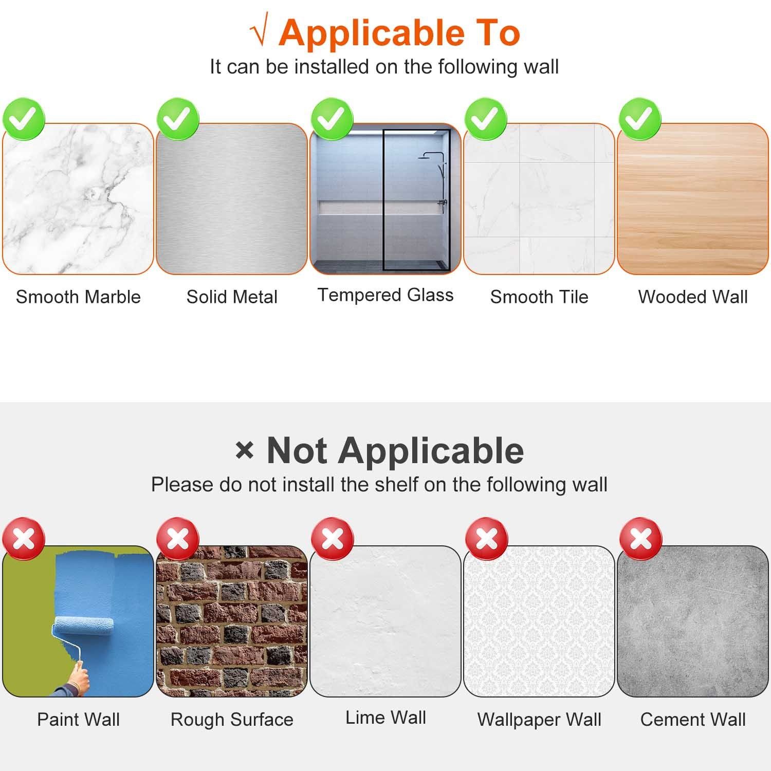 *Adhesive With Strong Stickiness*:Come with 8 strong adhesive stickers; just apply them on your shower wall then hang your organizer. Say goodbye to holes; marks; or sticky residue on your walls. We recommended 4 stickers to hold a rack.