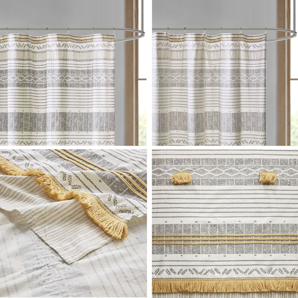 Bring style and texture to your bathroom decor with the INK+IVY Cody Cotton Stripe Printed Shower Curtain. This 100% cotton shower curtain features a beautiful multi print stripe pattern for a casual, sophisticated look; while the tassel pom pom trim detailing adds an artisan touch. Machine washable for easy care, this shower curtain is also OEKO-TEX certified meaning it does not contain any harmful substances or chemicals for the best in quality comfort and wellness. Each shower curtain measure 72"x72" and is finished with 12 button holes at the top making it easy to hang; hooks, rod, and a water repellant liner are not included and will need to be purchased separately. Complete the look with coordinating bedding, available and sold separately.