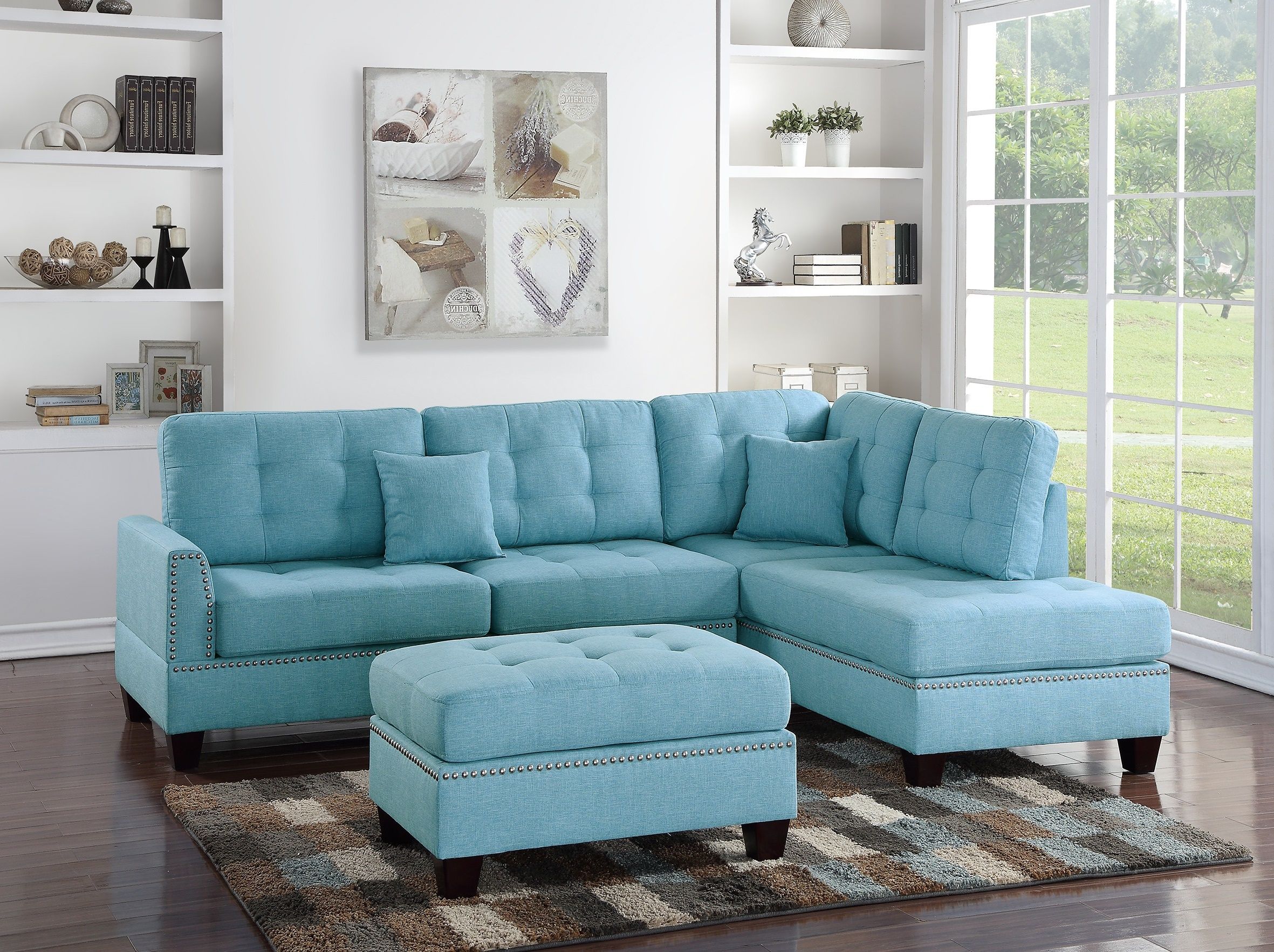 Home > Modern Blue Color 3pcs Sectional Living Room Furniture Reversible Chaise Sofa And Ottoman Tufted Polyfiber Linen Like Fabric Cushion Couch Pillows