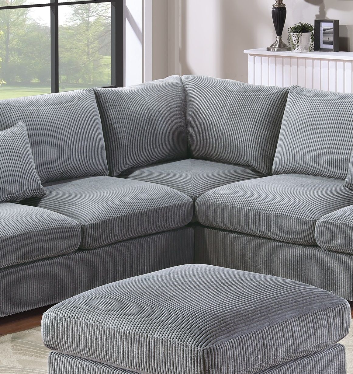 Description :-This plush L-shaped sectional is a spacious gathering spot to entertain friends and family. The sectional stands in low legs that are just barely visible giving it its modern look. It's wrapped in super soft corduroy in a warm neutral hue that makes it even more inviting to family and friends.Product Dimensions :-LAF & RAF Loveseat: 65" x 34" x 35" HCorner Wedge: 34" x 34" x 35" HCocktail Ottoman: 29" x 29" x 20"HOverall Sectional : 99" x 99" x 35"HListing Includes :- 4pcs Sectional Sofa Set (LAF & RAF Loveseat, Corner Wedge And Cocktail Ottoman) Only.Assembly : Simple Assembly Required.Features:-•Contemporary•Fog Color•Corduroy•Cocktail Ottoman•Pillows Included