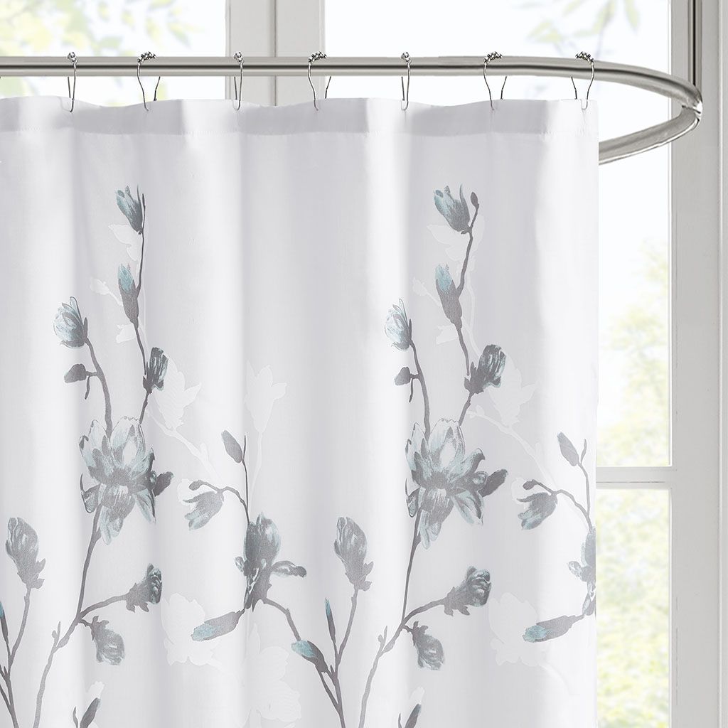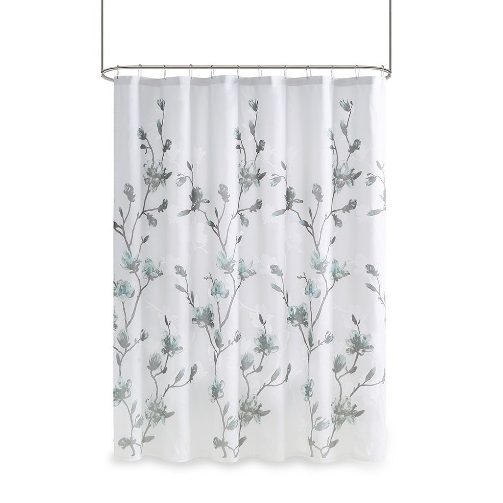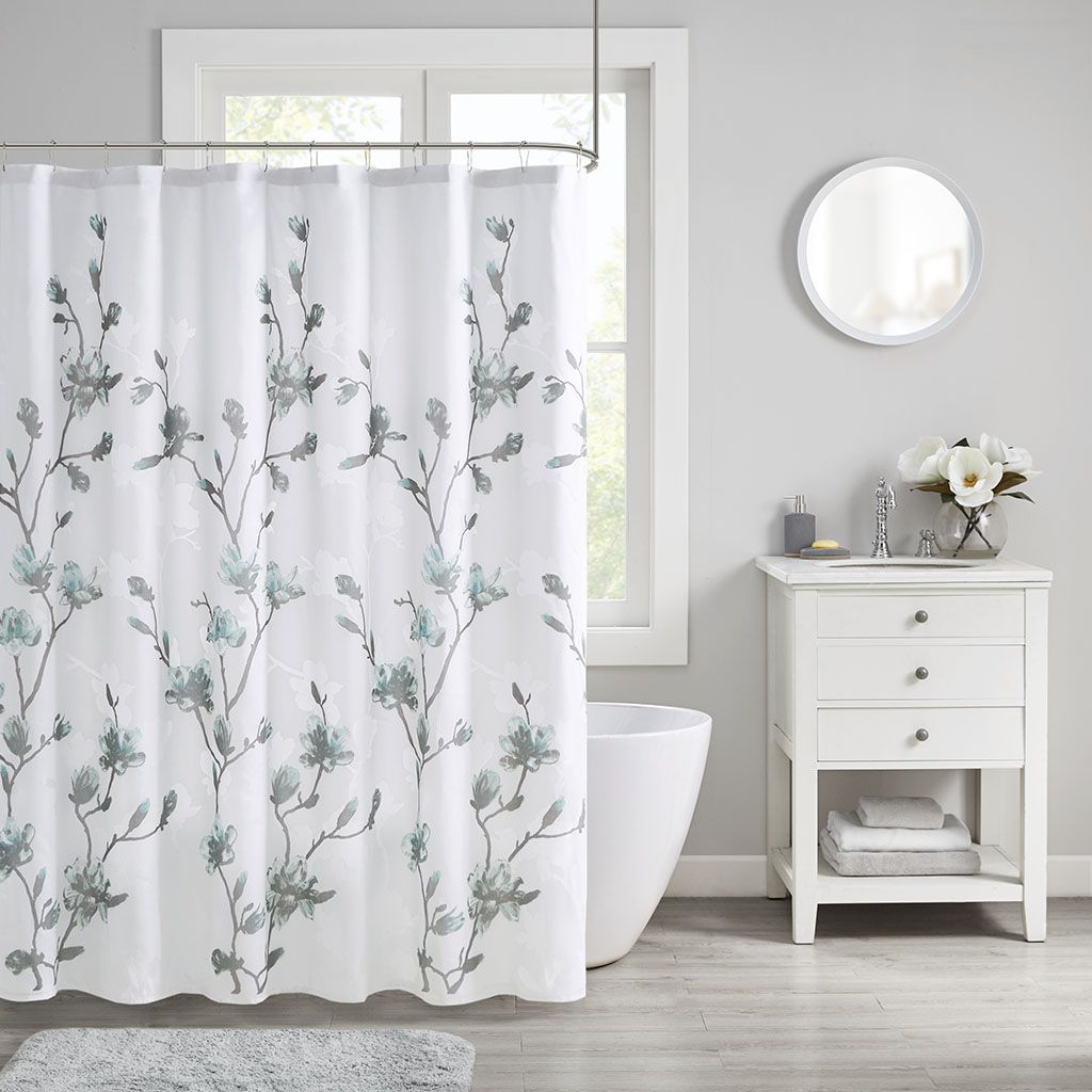 Add a soft touch of beauty to your bathroom with our Madison Park Magnolia Floral Printed Burnout Shower Curtain. This light weight shower curtain features a beautiful floral printed burnout design in soft aqua and grey hues, for a fresh and modern duet. An added microfiber liner provides better privacy and drapability; while still machine washable for easy care. Measuring 72"x72", this floral shower curtain is the perfect addition for a lively, feminine touch.