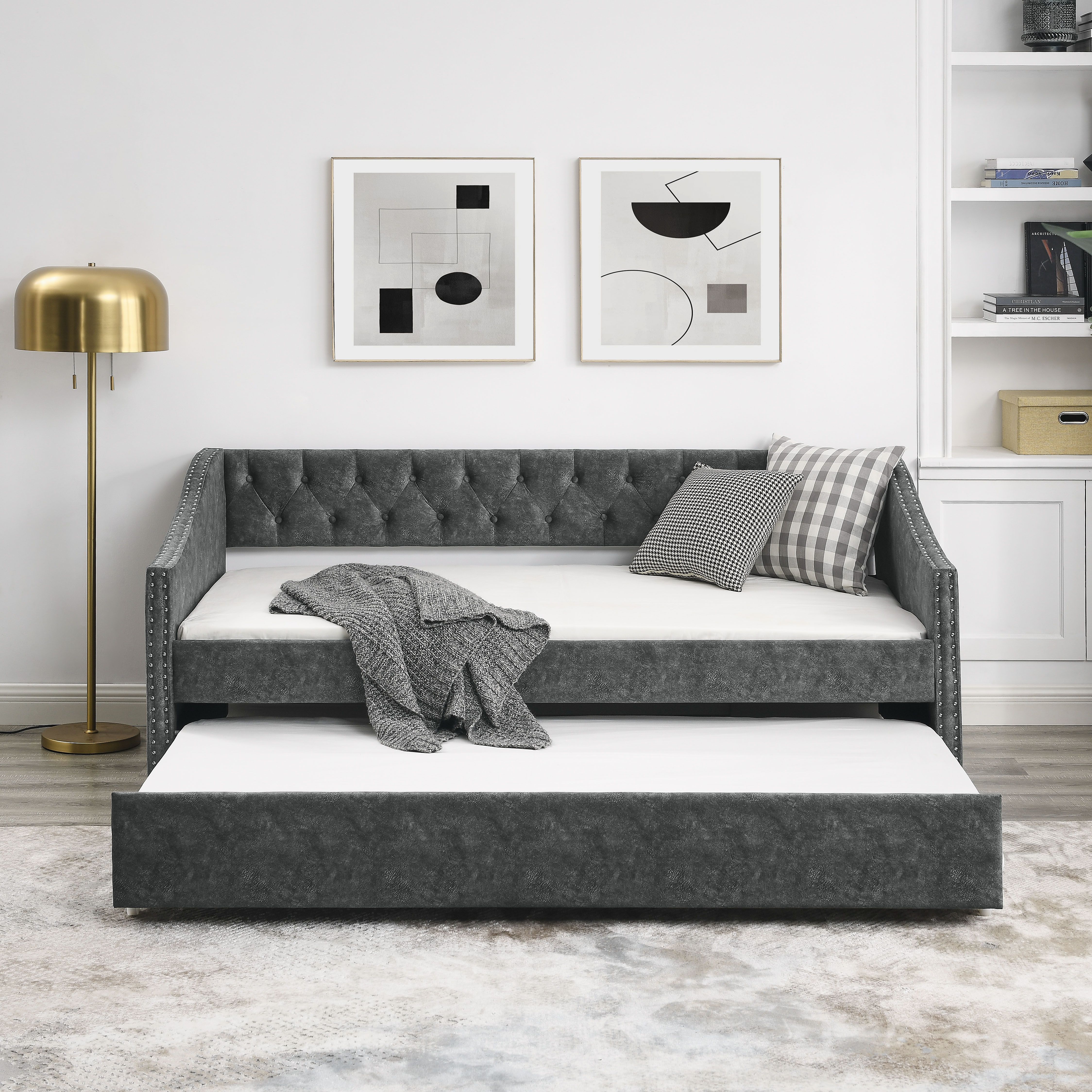 [Stunning Look] This mid-century - inspired daybed features a button tufted back which creates an elegant look. The waved shape arms decorated with nailhead trimming blends chic details with classic style. This daybed lends a sophisticated air to your home.