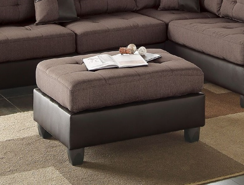 Description: Both multi-dimensional in color and texture, this 3-piece sectional features linen-like seating framed in dark brown faux leather. Both accent tufting and light stitching add to the contemporary style. This sectional also includes a matching cocktail ottoman. Available in chocolate, grey, or teal.