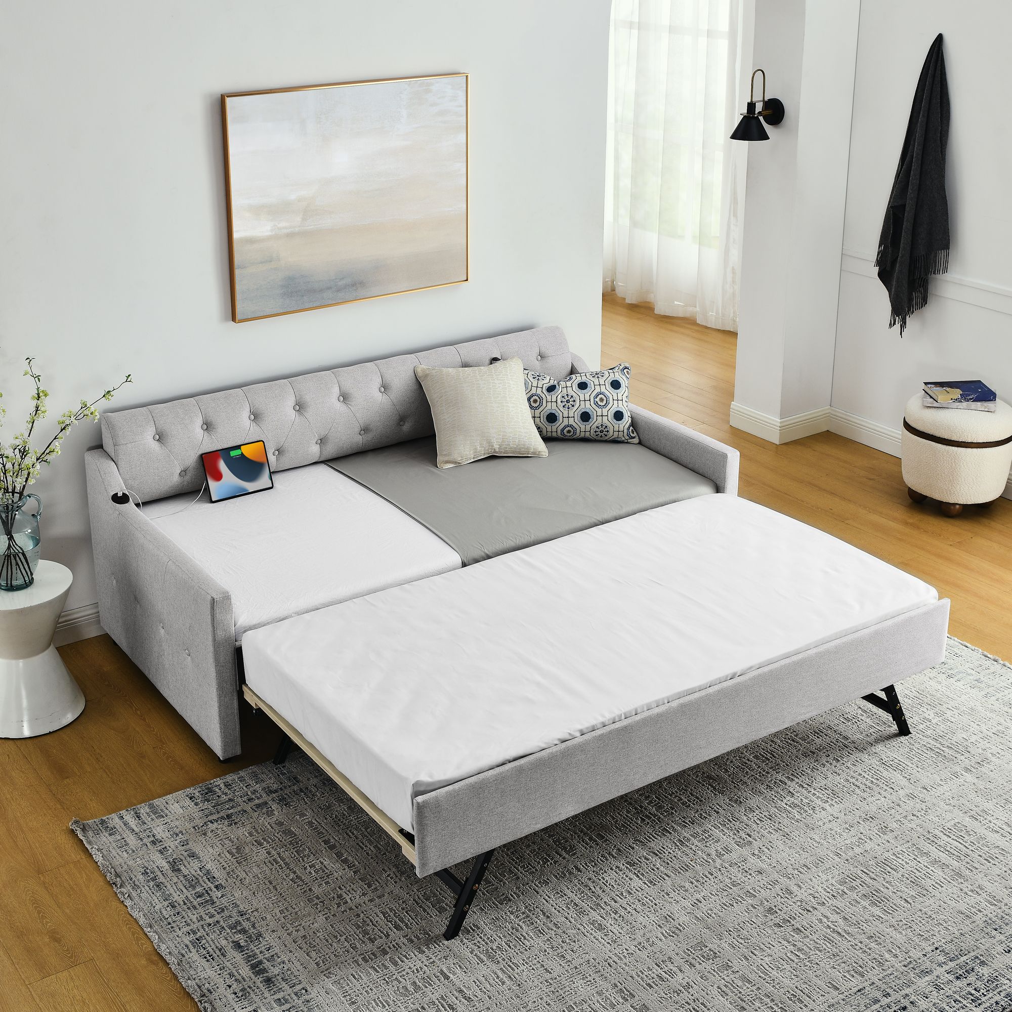 [Multifunctional Trundle] The daybed with a handy pull-out trundle takes up minimal space for the spontaneous sleepover guest.And it can be laid directly on the ground, or it can be erected at the same height as the daybed.