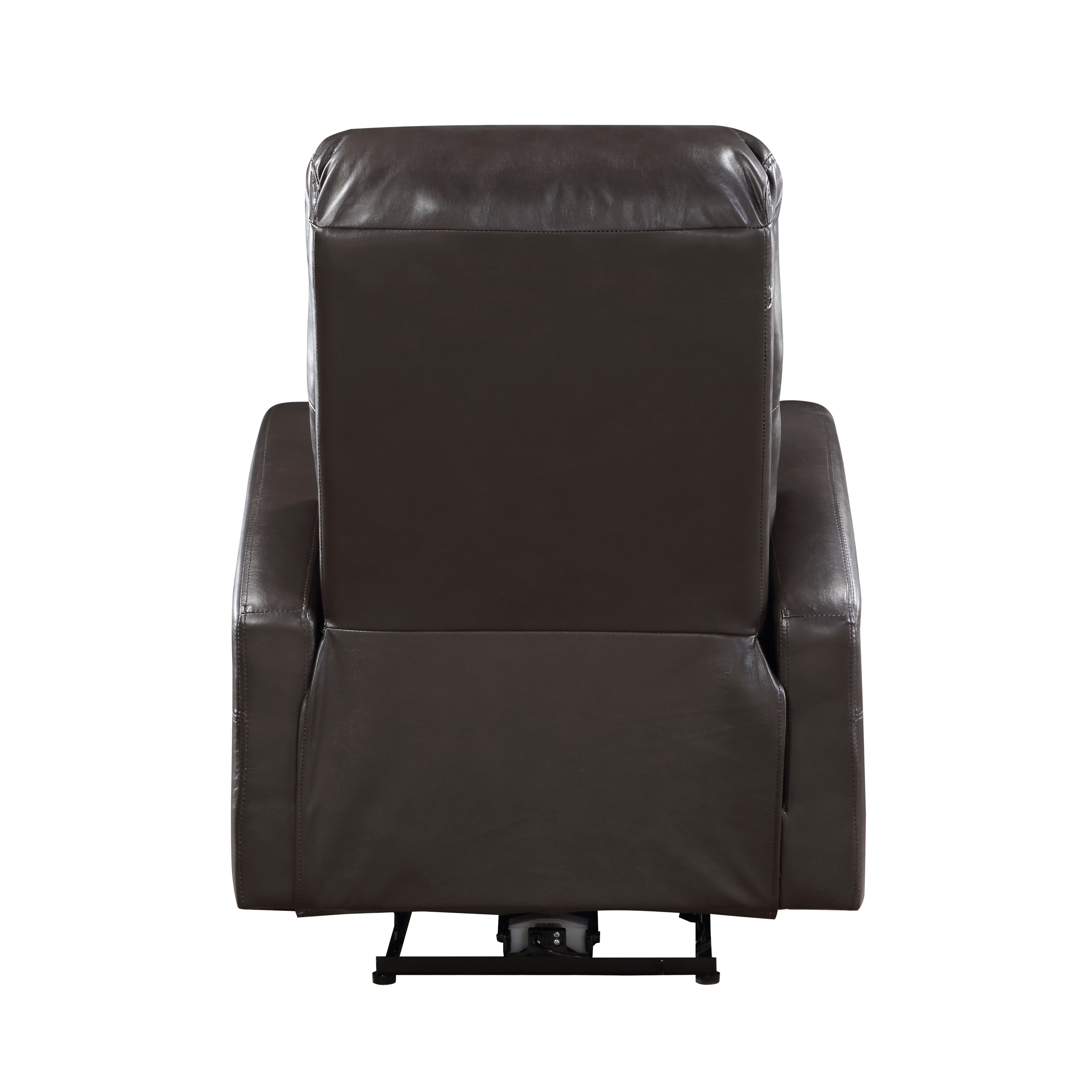 Whether utilized as an accent to your existing living room suite or as a stand-alone chair in your home, the Wiley Collection will add a modern touch to your space. The power motion reclining mechanism allows you to reach a relaxed position with just the push of a button. Clean lines are covered in brown faux leather in this contemporary selection.PRODUCT DIMENSIONS: Overall Dimension: 29.5" x 38" x 41"HSeat Width: 20"Seat Depth: 20"Seat Height: 20.5"Fully reclined length: 64.5"Fully reclined height: 31.5"Doorway width: 25.75"Required back clearance to recline: 3.5"Listing Includes: One Power Reclining Chair Only.Simple Assembly Require.