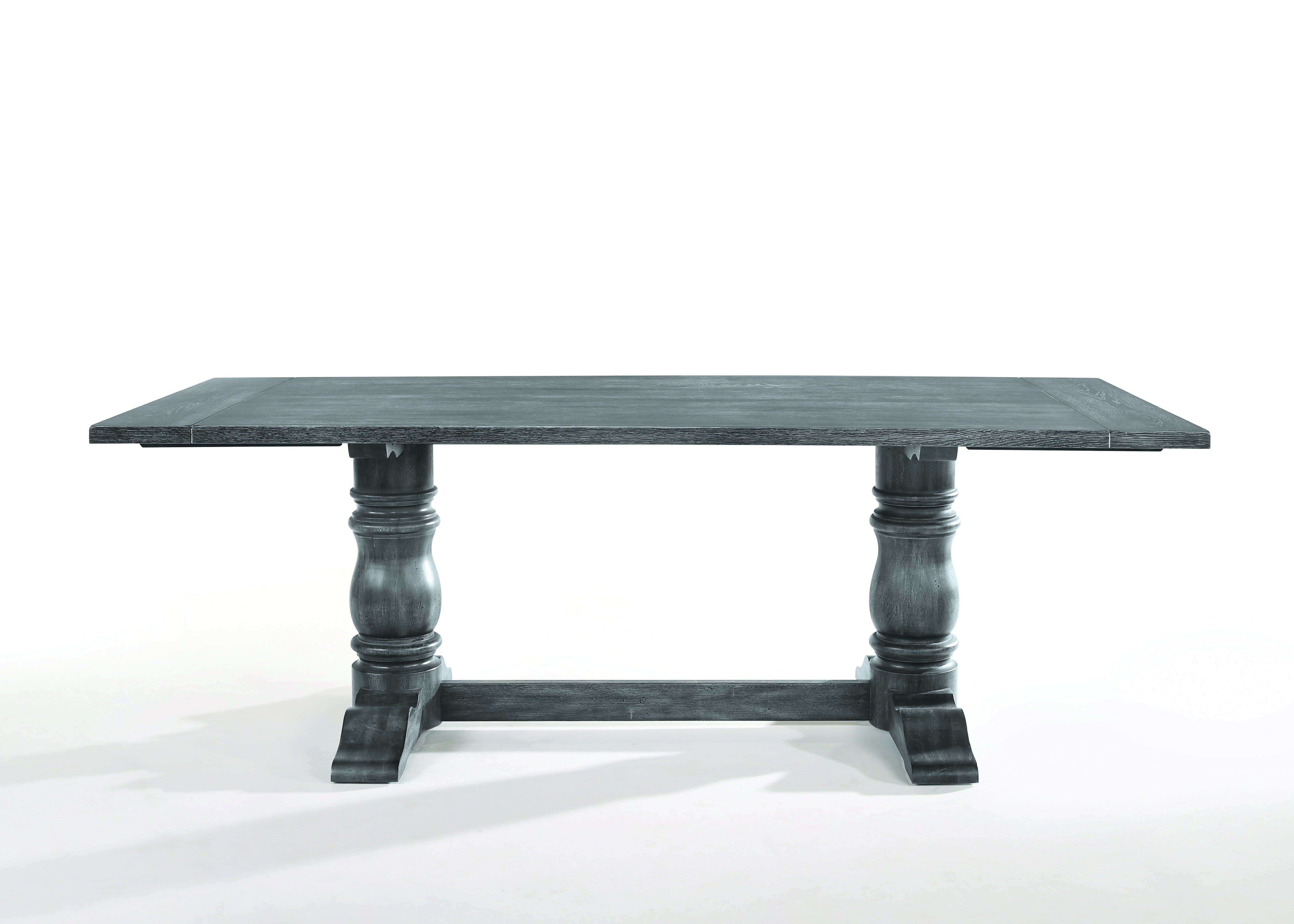 This elegant dining table in a weathered gray finish exudes rustic charm, featuring a timeless rectangular trestle design with a fixed top that adds a touch of simplicity and sturdiness.