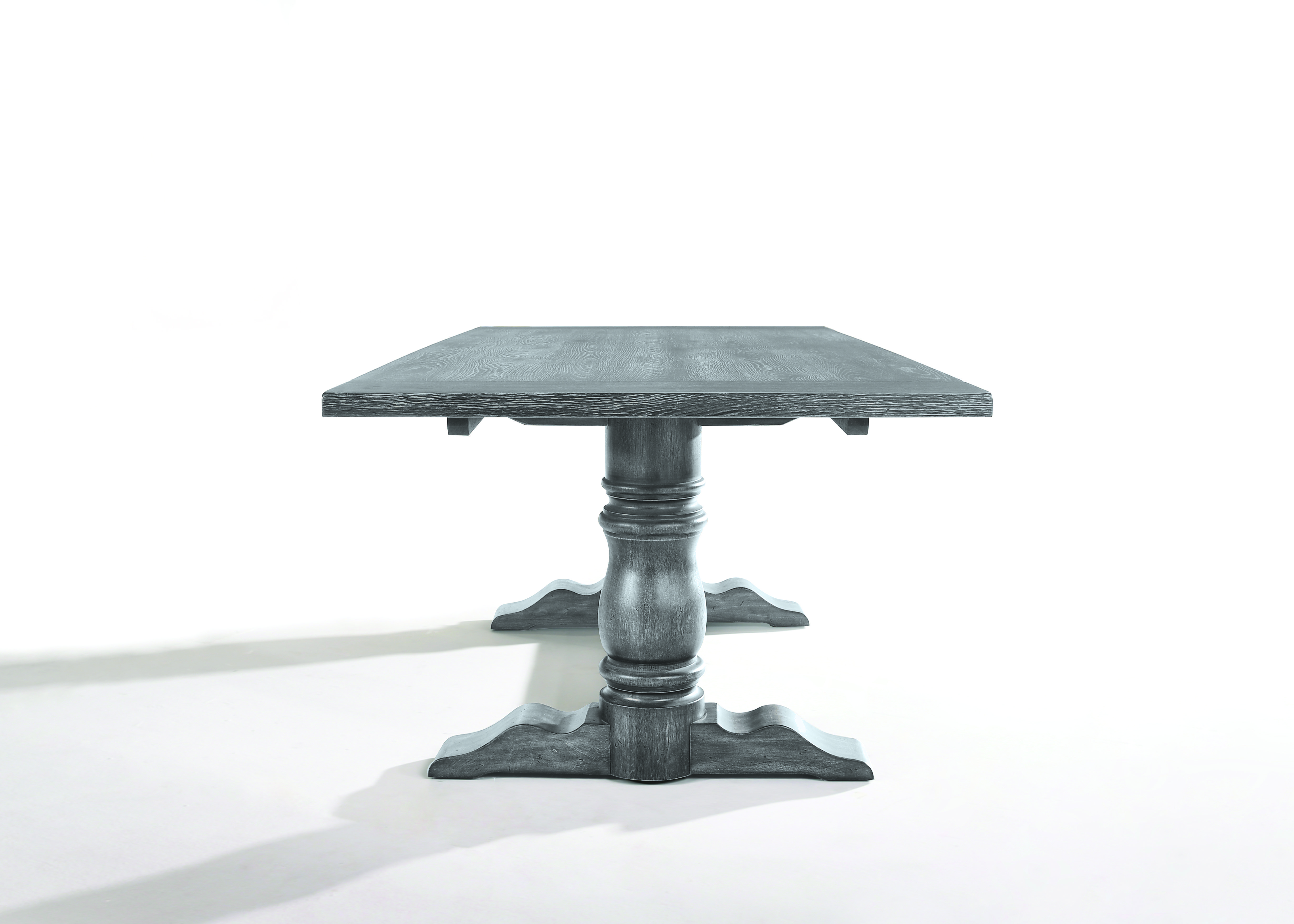 The trestle base, with its double turned empire pedestals, provides both stability and a striking visual appeal, perfectly complementing the weathered finish.