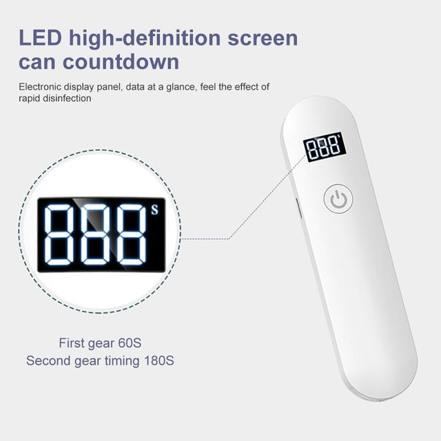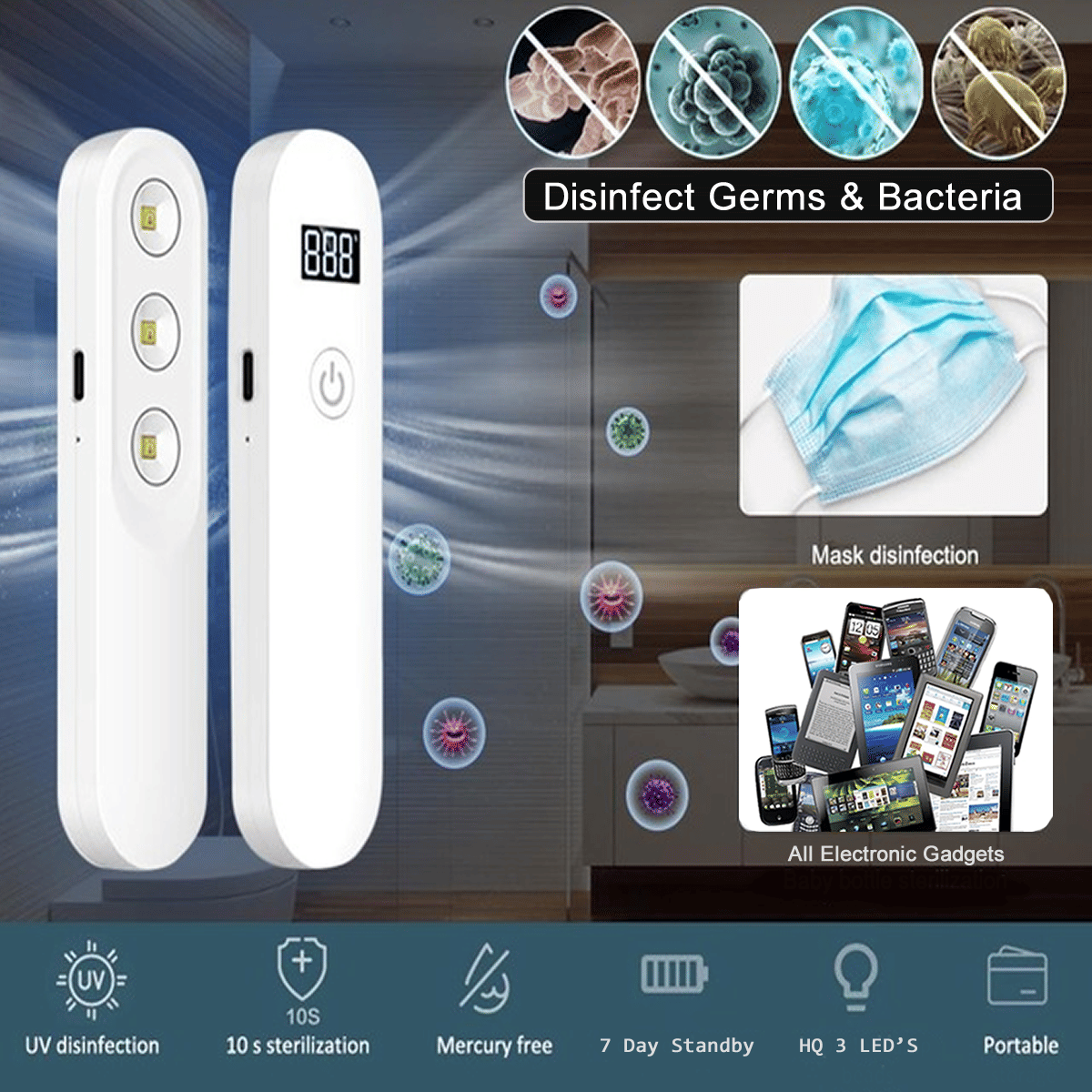 Always carry this handheld; portable Mini Ultraviolet bar light that can eliminate and disinfect germs and viruses in seconds; which can not be seen with the naked eyes but they are pretty much there practically on everything from our phones; iPads; and laptops to kid's toys; remote controls; and door handle. Easy to charge with the rechargeable battery and easy to carry with you;  its charge lasts for 5 to 6 hours. Take it with you anywhere you go and sanitize in 10 seconds the car seats; steering wheels; elevator buttons even the toilet seats in hotels; theaters; or any other public areas. It also eliminates any airborne traces of germs in your close proximity.