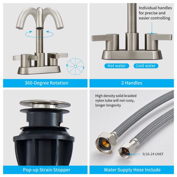 [EASY INSTALLATION]: The brushed nickel bathroom faucet comes with a plastic Pop up Sink Drain Assembly with Overflow and 2 high-density solid braided nylon tub water supply lines. 4-inch centerset and 3 hole mount design allow for easy installation. Detailed installation instructions will guide you on how to perform installation quickly.